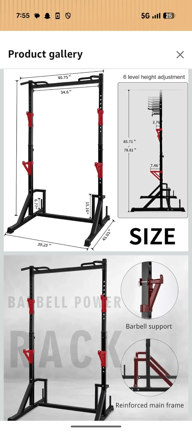 This adjustable power rack is great for home workouts! It features a multifunctional pull-up bar and adjustable barbell supports. The main frame height is also adjustable. Get your fitness on at home!