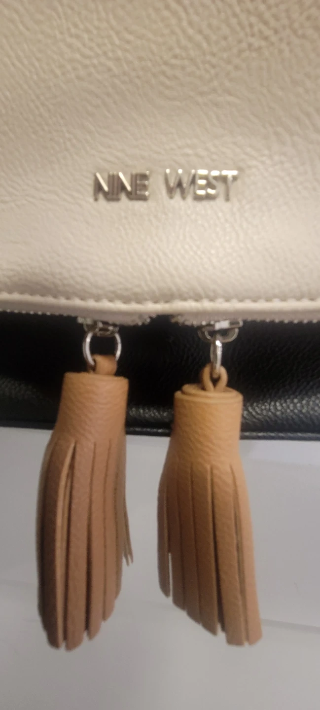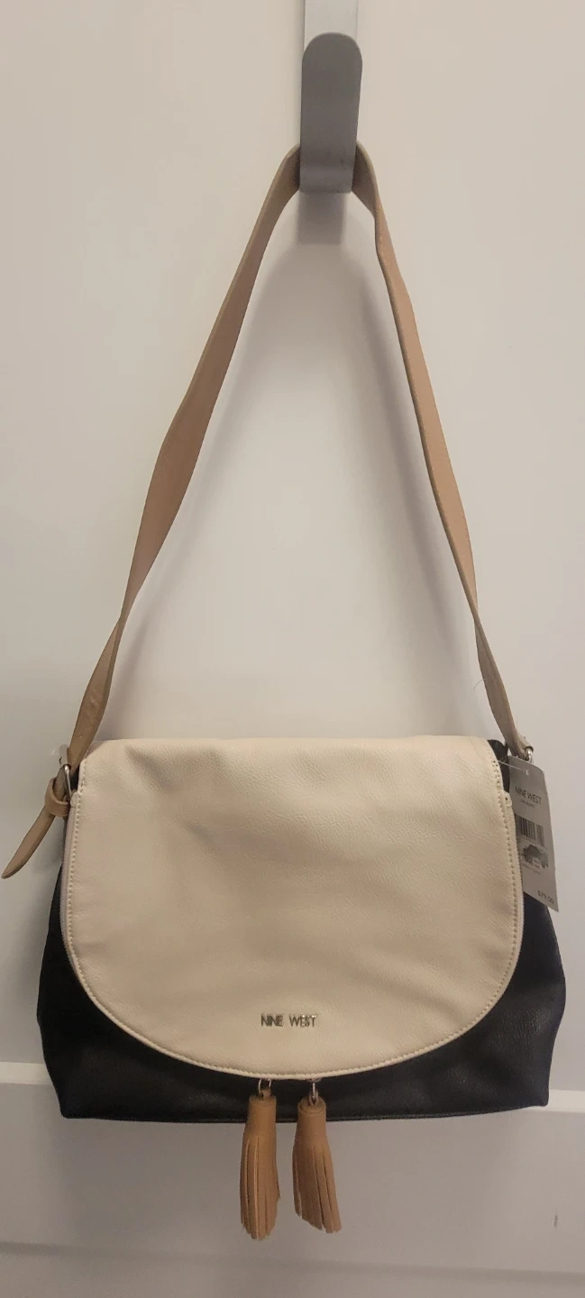 This Nine West shoulder bag features a chic two-tone design with cream and black panels. It's adorned with cute tan tassels for a stylish touch. The adjustable strap makes it comfy to wear all day!