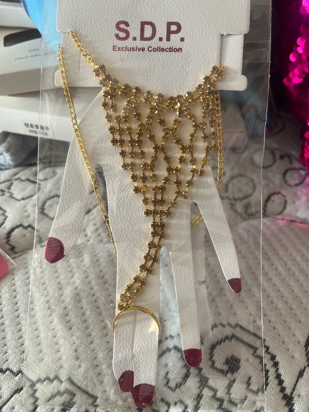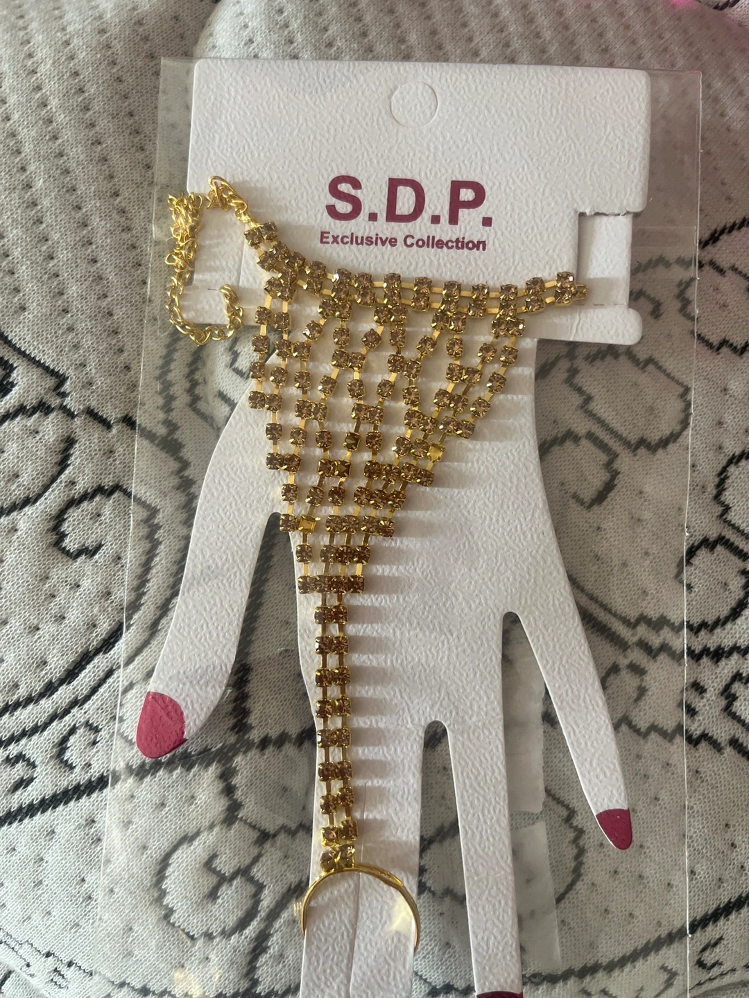 Gold-toned chain with rhinestones. Worn on the hand with a ring that sits on the finger.