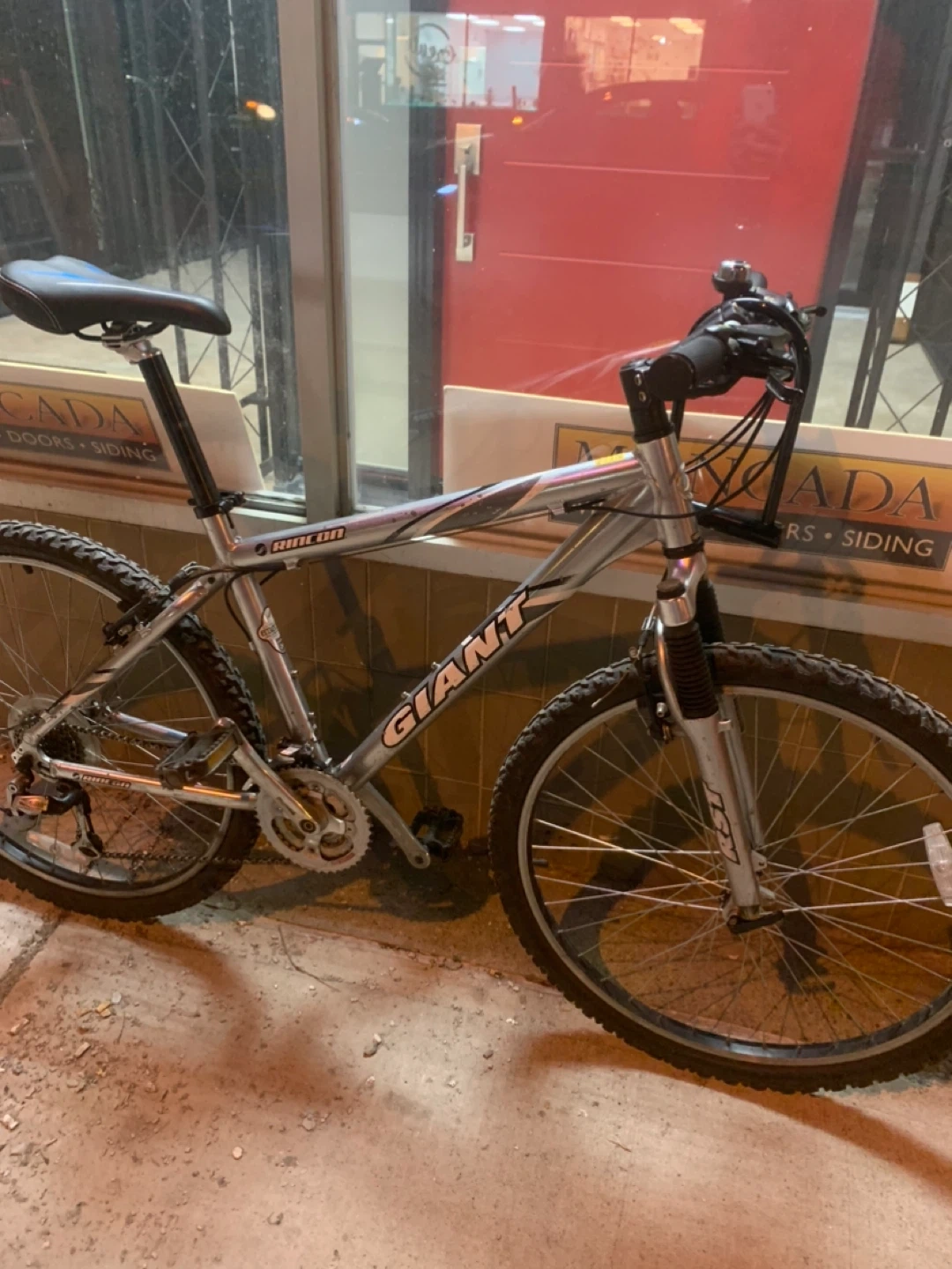 This is a silver Giant mountain bike with front suspension. It has disc brakes and a Shimano gear system. It's ready for your next adventure!