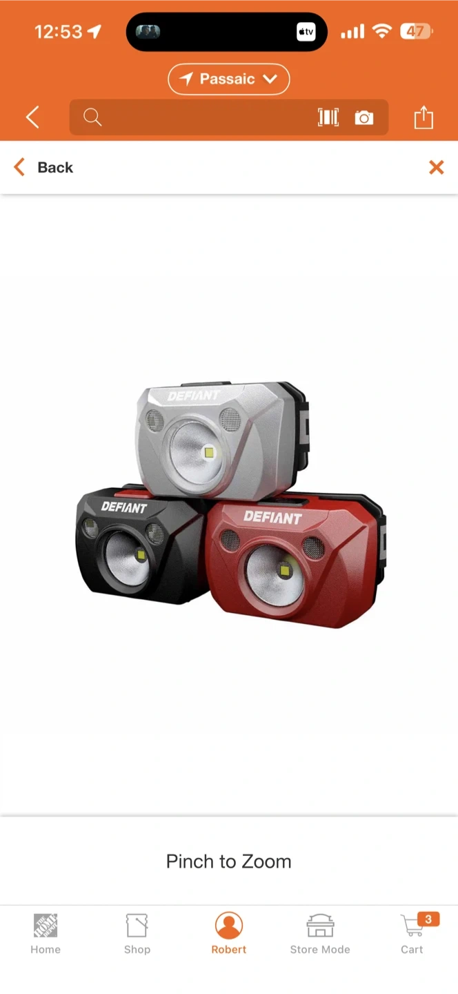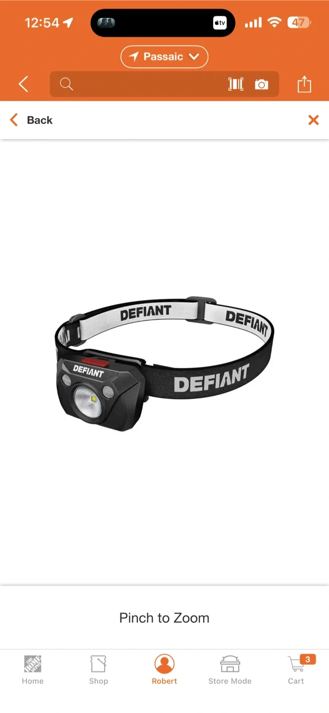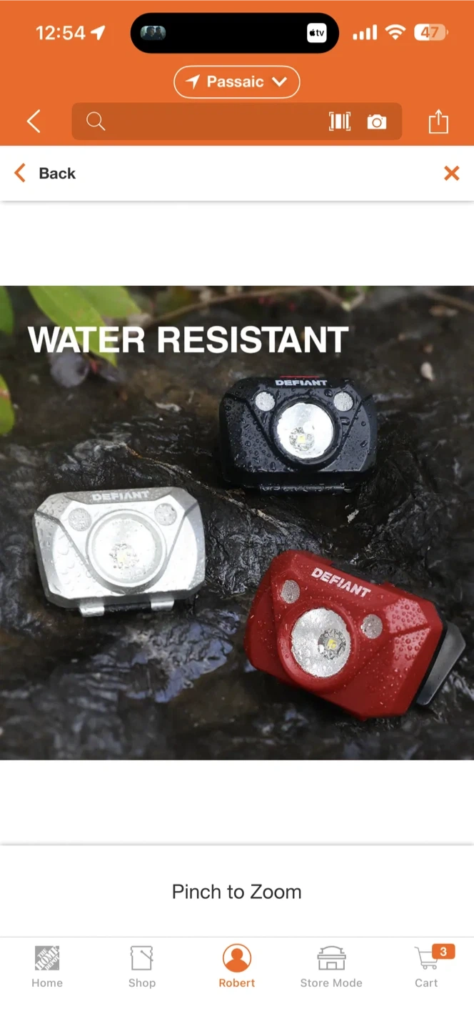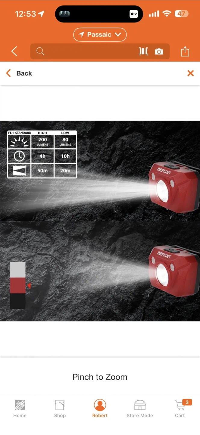 This Defiant LED headlamp is water resistant. It offers 200 lumens on high for 4 hours and 80 lumens on low for 10 hours. The beam reaches up to 50 meters on high and 20 meters on low. It's great for hands-free lighting during outdoor activities or projects.