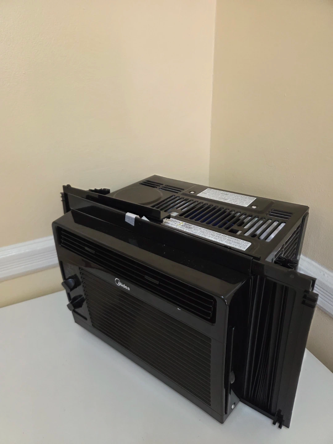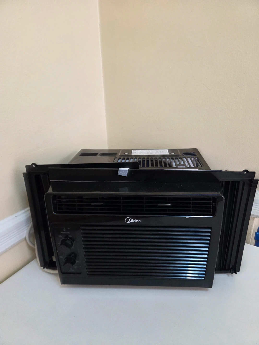 This is a Midea window air conditioner. It's black and comes with adjustable side panels. The unit has two control knobs on the front.