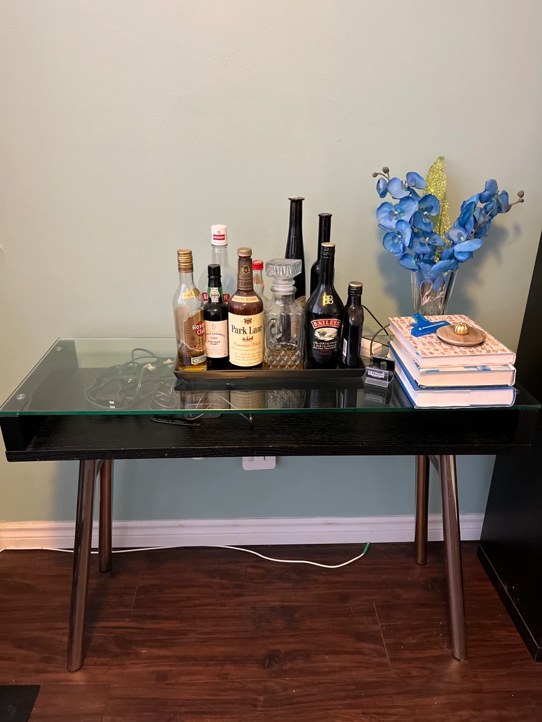 Sleek black console table with a glass top and metal legs. It's perfect for a hallway or as a display piece.