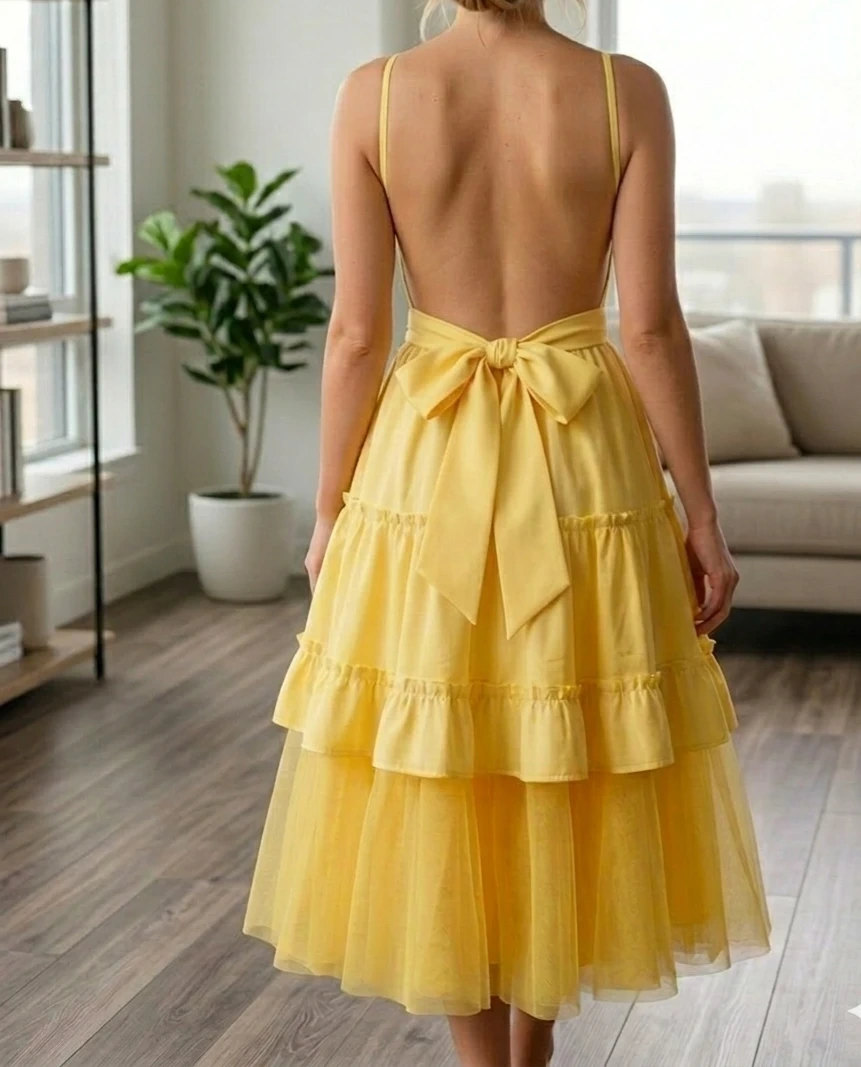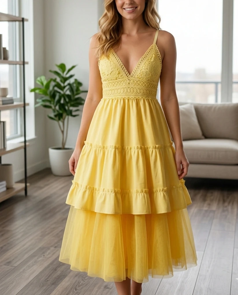 This sundress features a yellow tiered design with delicate lace detailing on the bodice. It has spaghetti straps and a playful bow accent at the back. Made for warm-weather occasions!