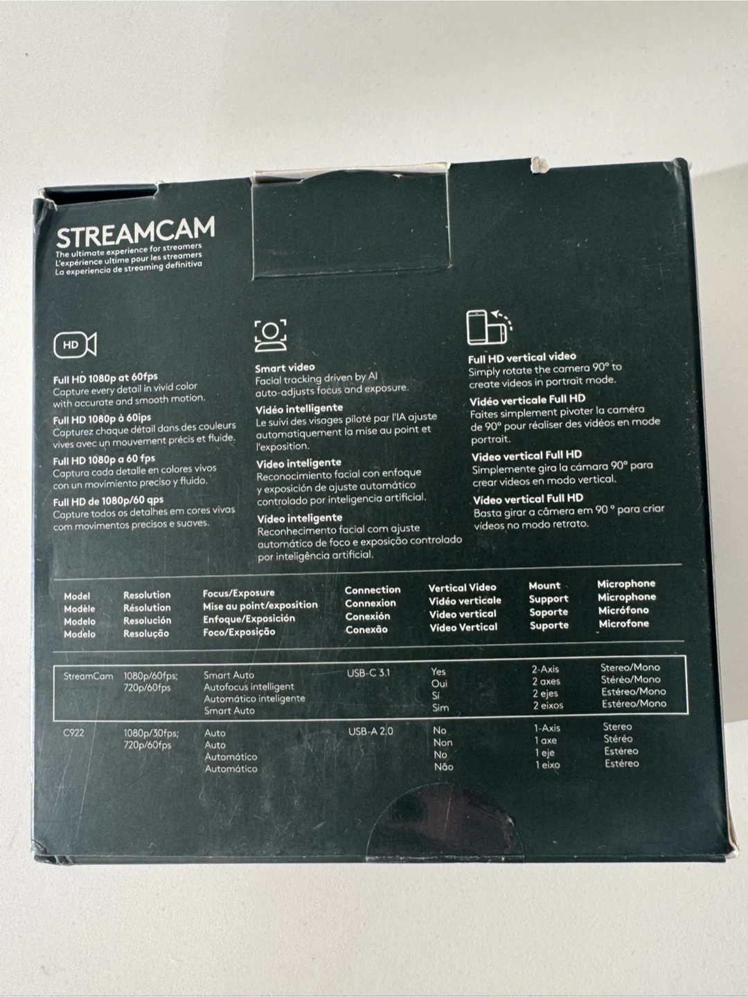 StreamCam by Logitech offers full HD 1080p video at 60fps for sharp, smooth footage. It features smart auto-focus and exposure, driven by AI for improved image quality. Connects via USB-C for reliable performance. Open box but never used.