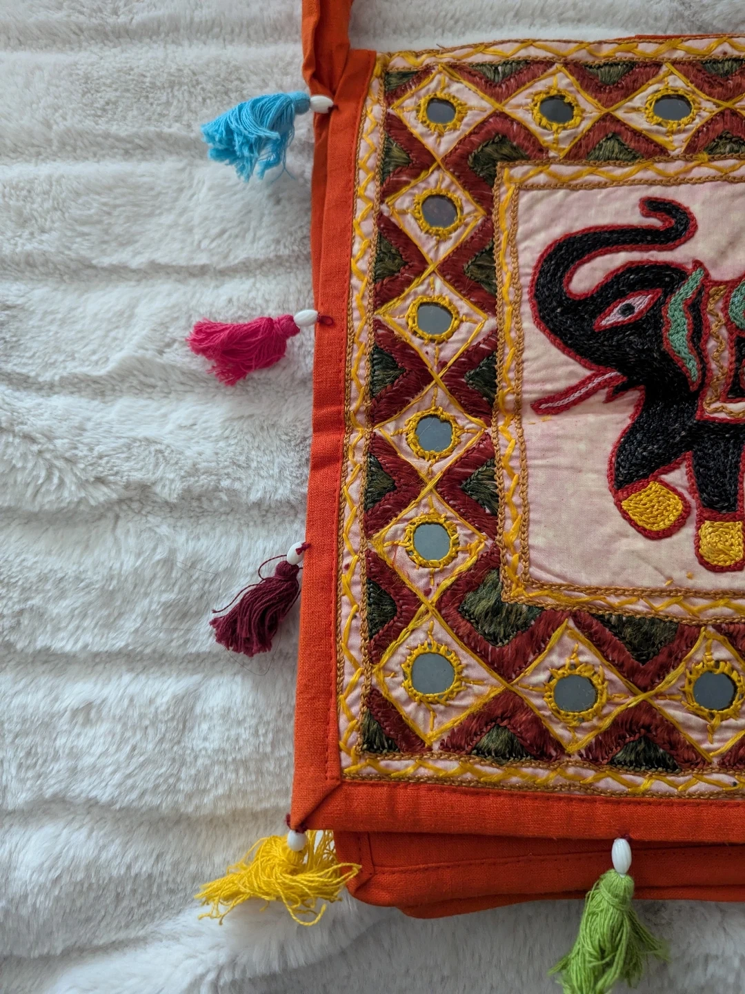 Brand new orange Bohemian sling bag features intricate embroidery of an elephant with colourful tassels. It has a zippered compartment and a long strap for easy carrying