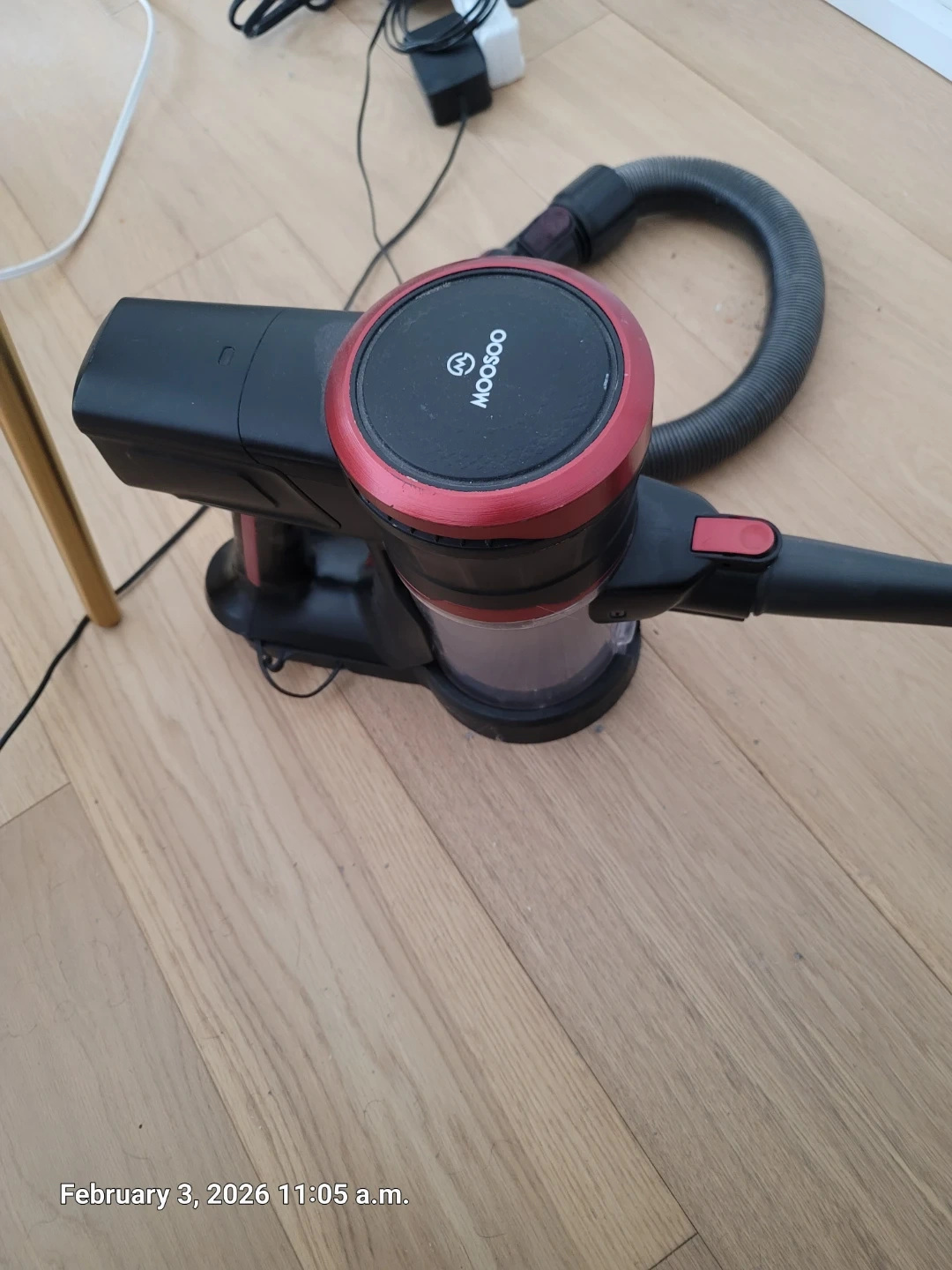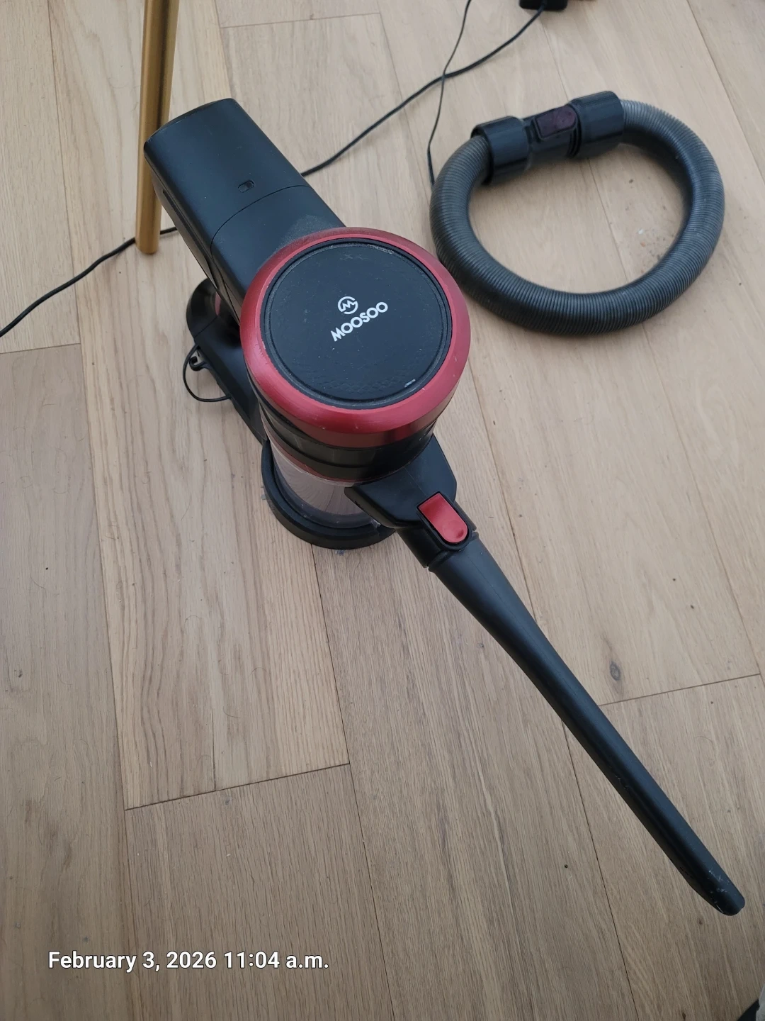 This is a MOOSOO cordless vacuum cleaner. It's black with red accents. Comes with a flexible hose attachment.