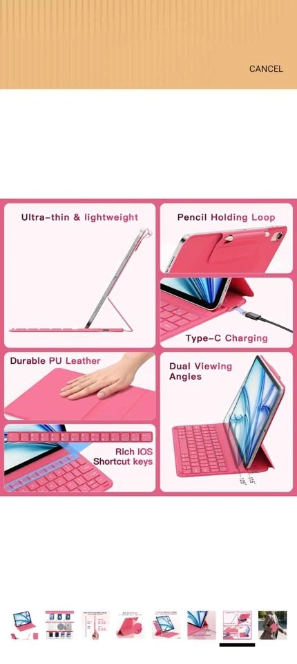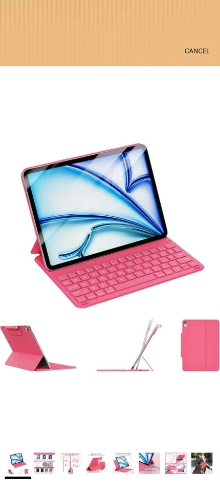 Brand new, unopened box. Ultra-thin and lightweight keyboard case for iPad Air, perfect for work, school, or everyday use. This sleek pink case includes a magnetic detachable keyboard and a secure Apple Pencil holder/buckle, making it super convenient for on-the-go productivity.