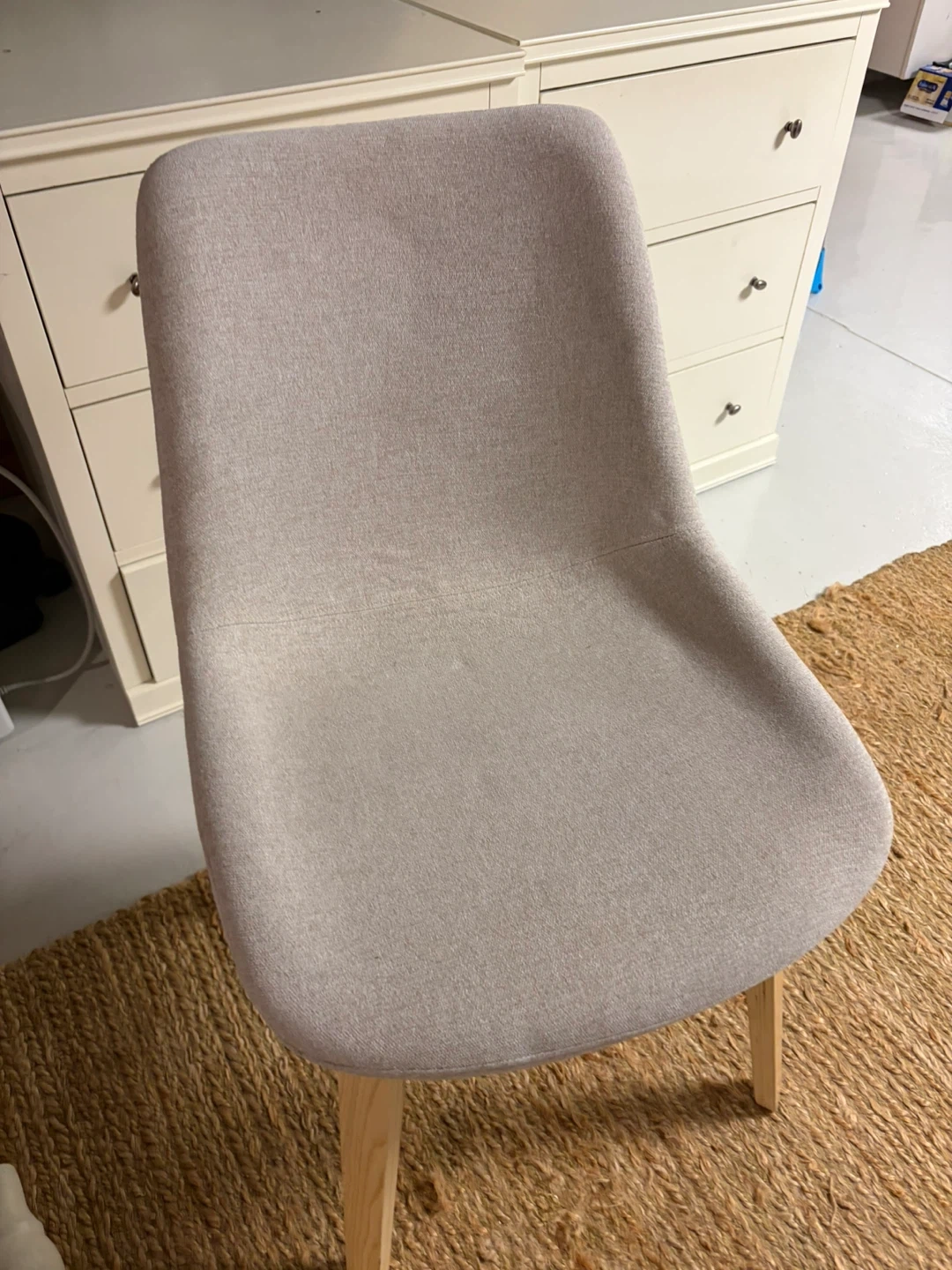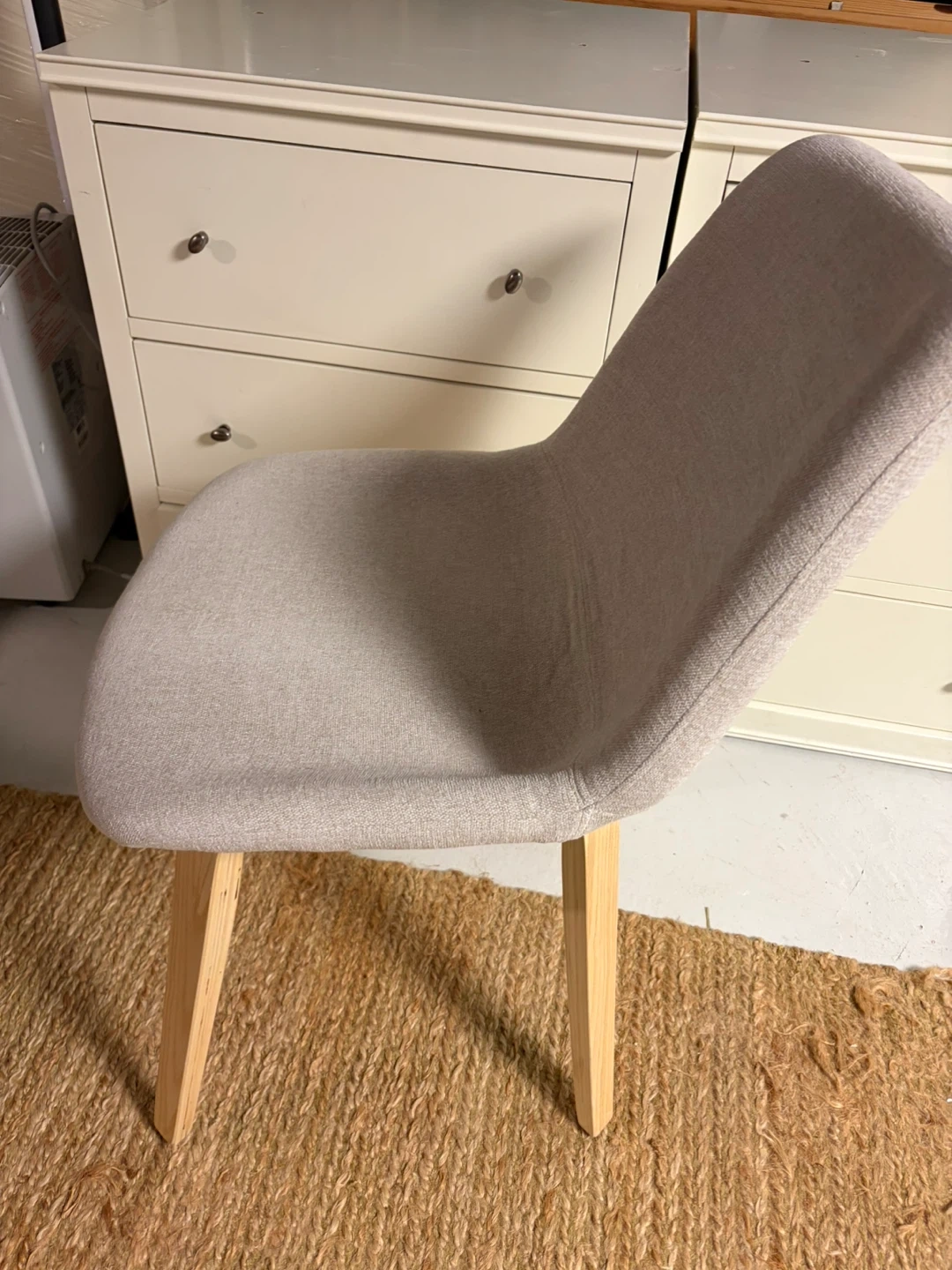 This is a stylish dining chair upholstered in a light grey fabric. It features solid wood legs for stability. It's a comfortable seating option for your dining room or kitchen nook.