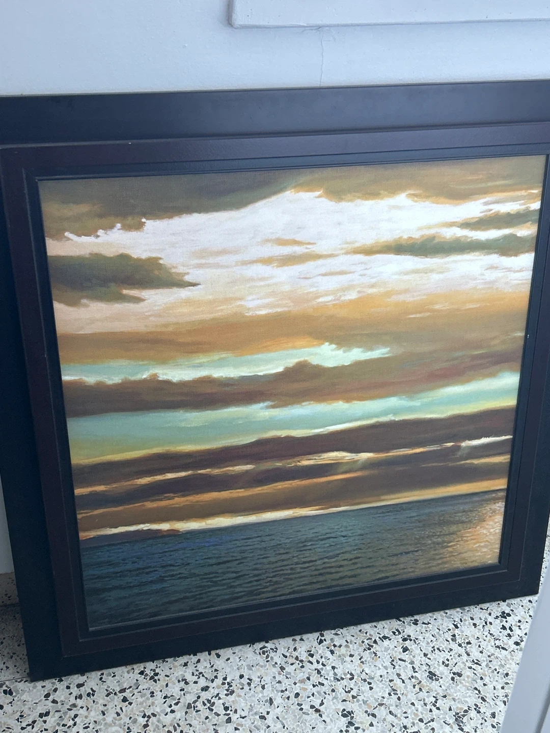 This is a framed painting of a serene ocean sunset with dramatic clouds. It's perfect for adding a touch of natural beauty to any room. The frame is a dark, classic wood.