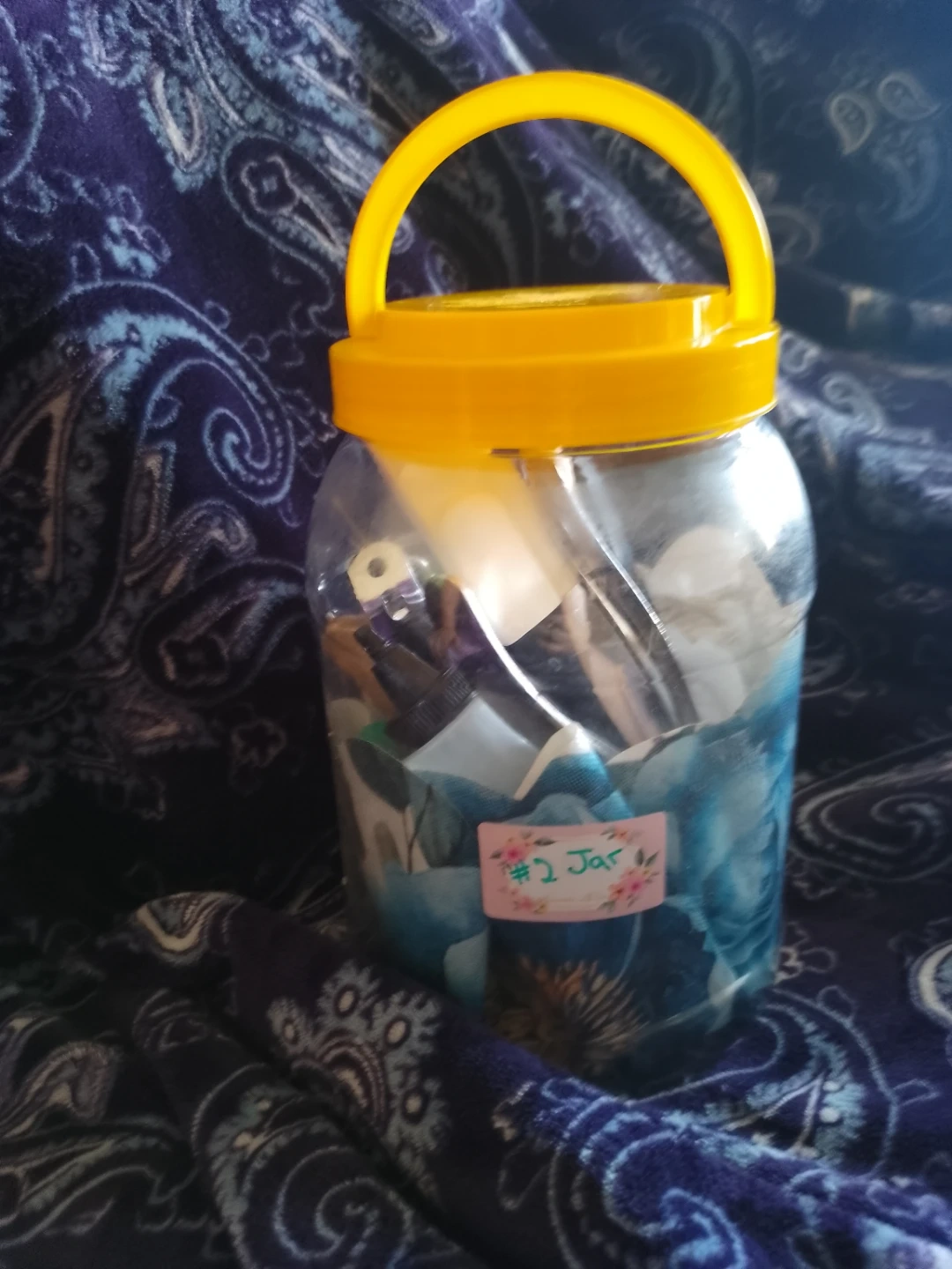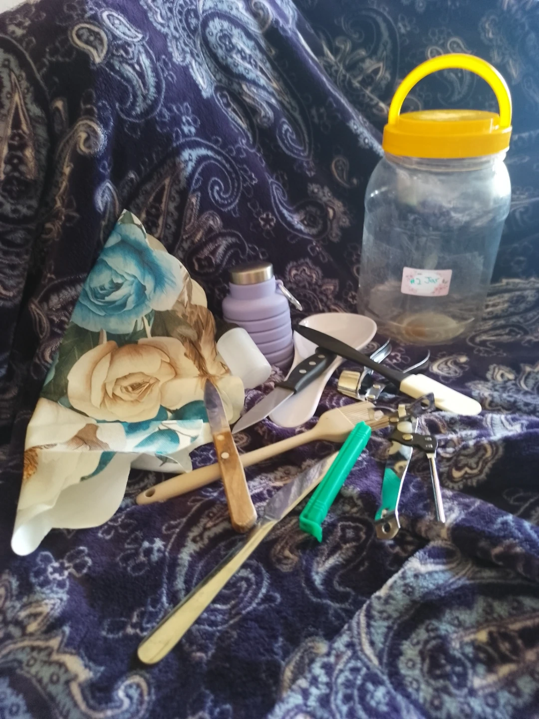 Jar #2. Have a 12 pieces. This is a large plastic jar filled with various kitchen utensils and small tools. It includes knives, a can opener, spoons, and other handy items. Useful for stocking a kitchen or for crafting projects!