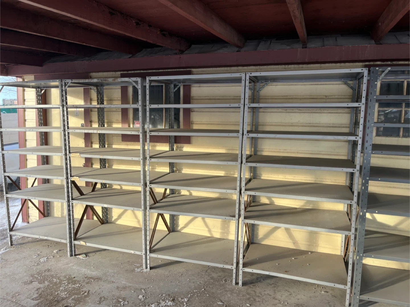 Heavy-duty metal shelving units with tiers, perfect for garages, workshops, or storage rooms. Sturdy construction, grey finish.