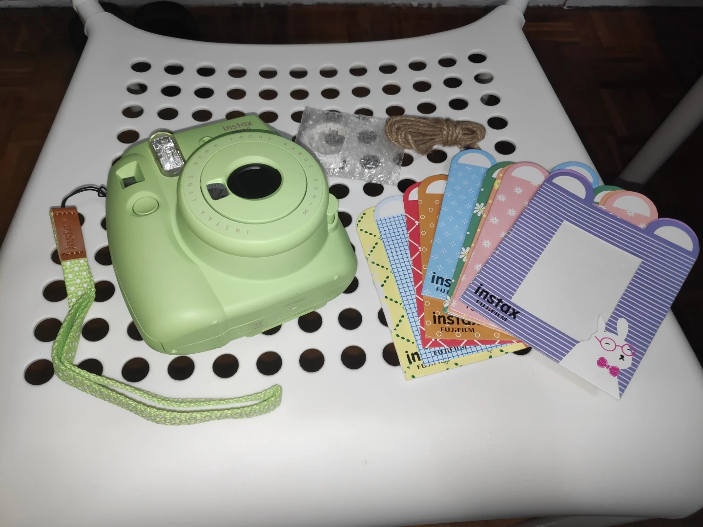 Fujifilm Instax Mini 9 instant camera only with shows items in light green. Comes with a strap and photo display cards. Perfect for capturing memories instantly!