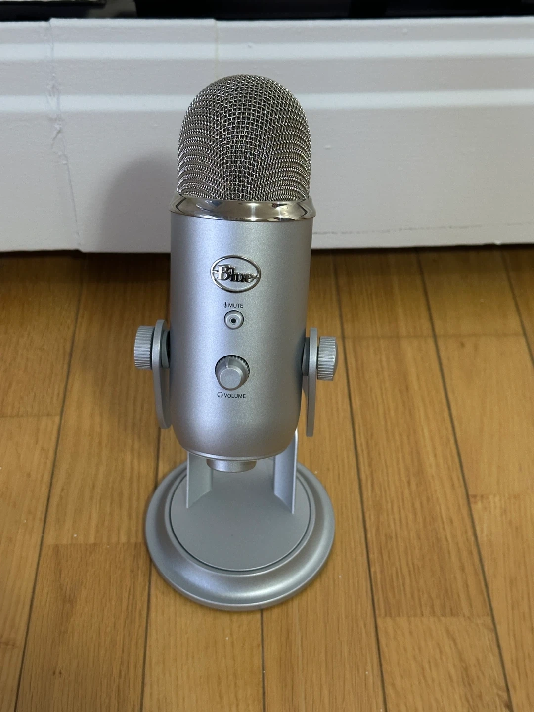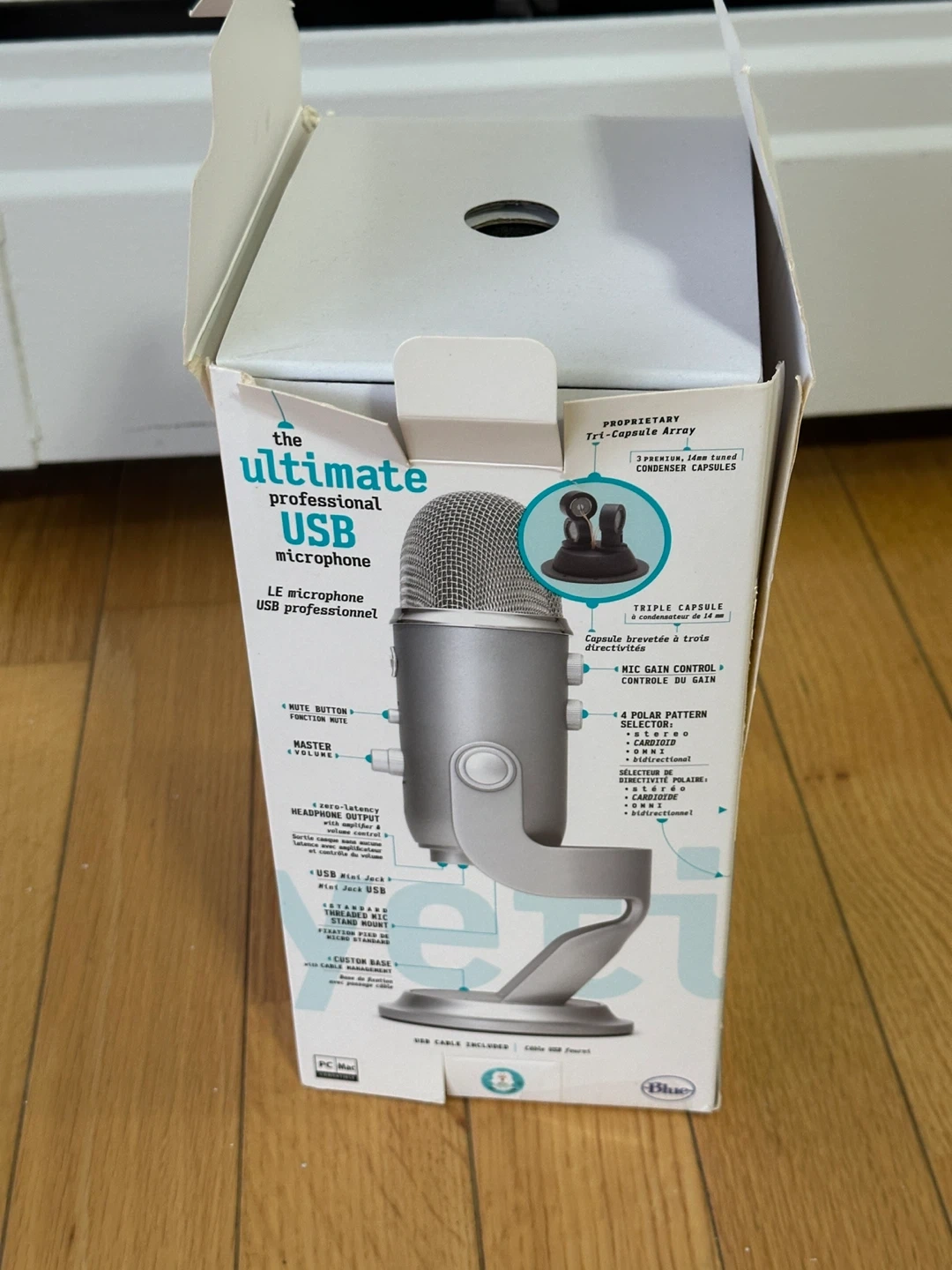 Selling a Blue Yeti USB microphone in silver. It comes with its original box and USB cable. This microphone is great for recording music, podcasts, or streaming. It features a tri-capsule array and four polar pattern selections. Get yours today!