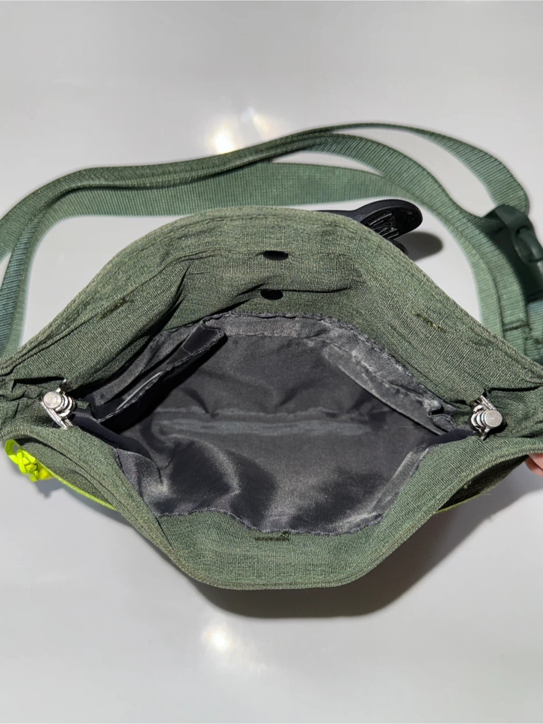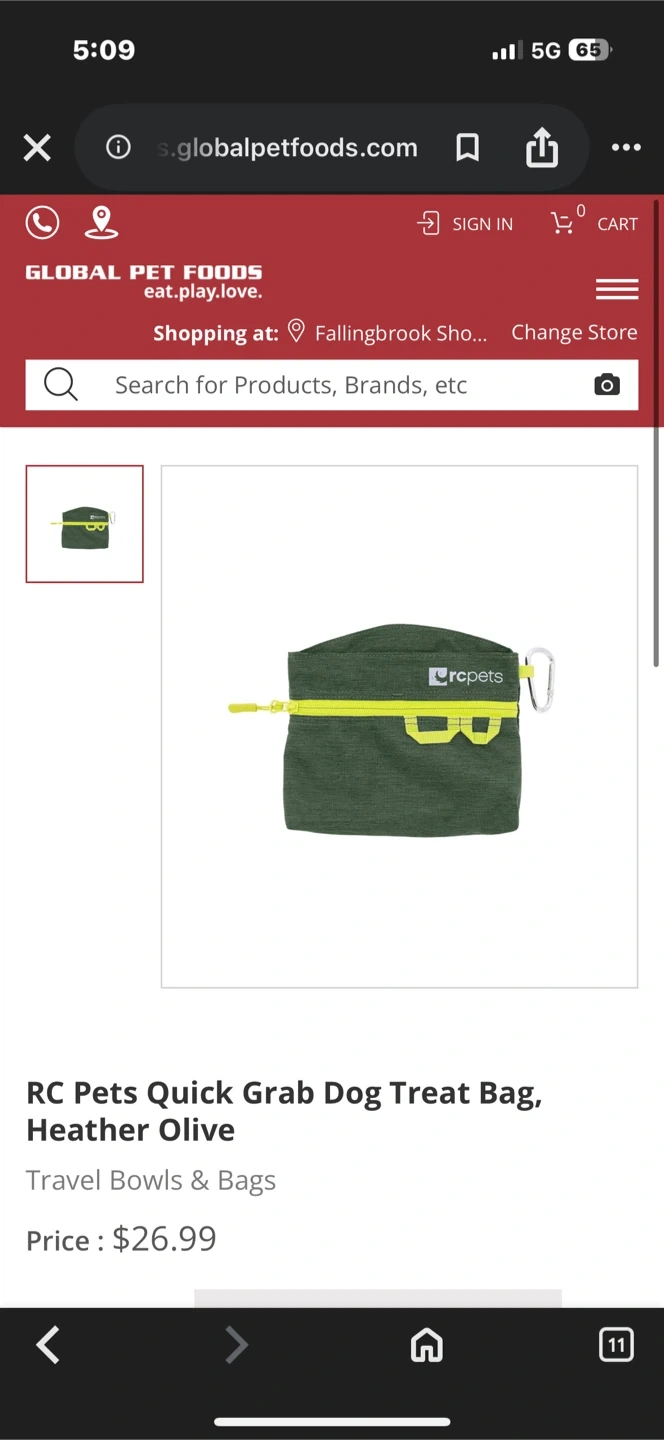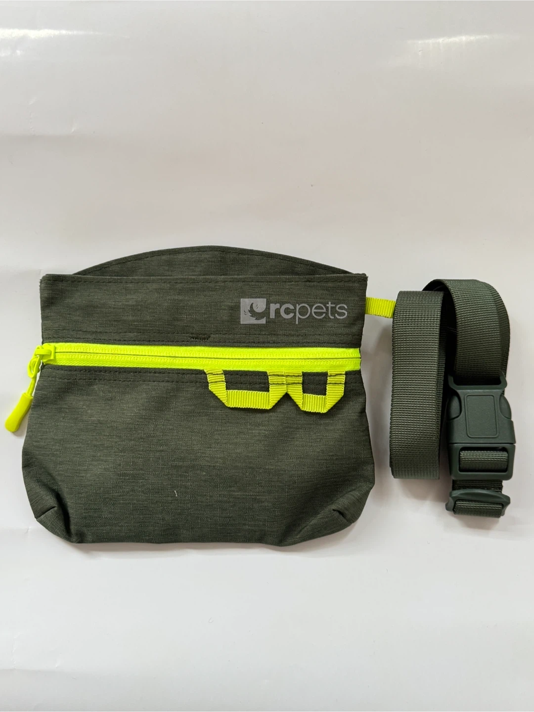 This RC Pets treat bag is in heather olive. It has a zippered top and a clip for attaching to a belt or bag. Perfect for carrying dog treats on walks!