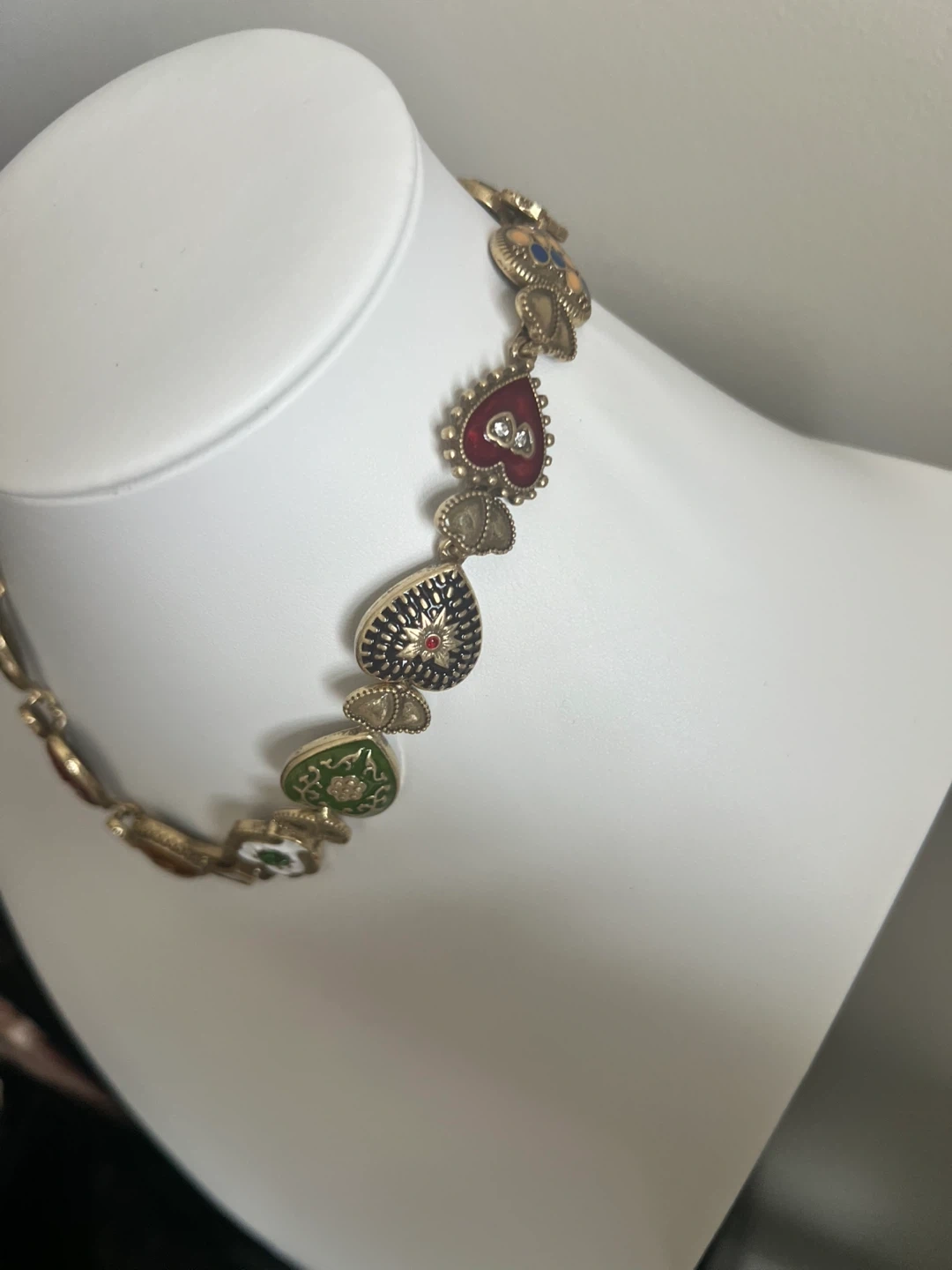 Beautiful gold-tone necklace featuring colourful enamel heart charms with intricate detailing. It also has coin-shaped charms with green jewel accents. It's a unique statement piece that adds a pop of colour to any outfit!