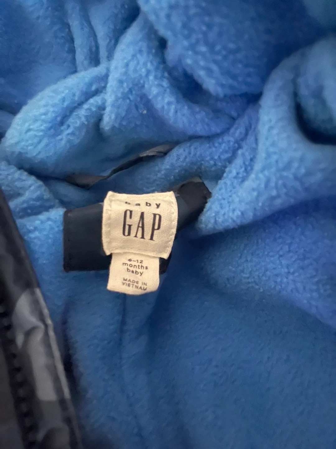 This is a Gap baby puffer snowsuit in a camo print. It's sized for 6-12 months. It's made of polyester and fully lined with fleece for warmth.