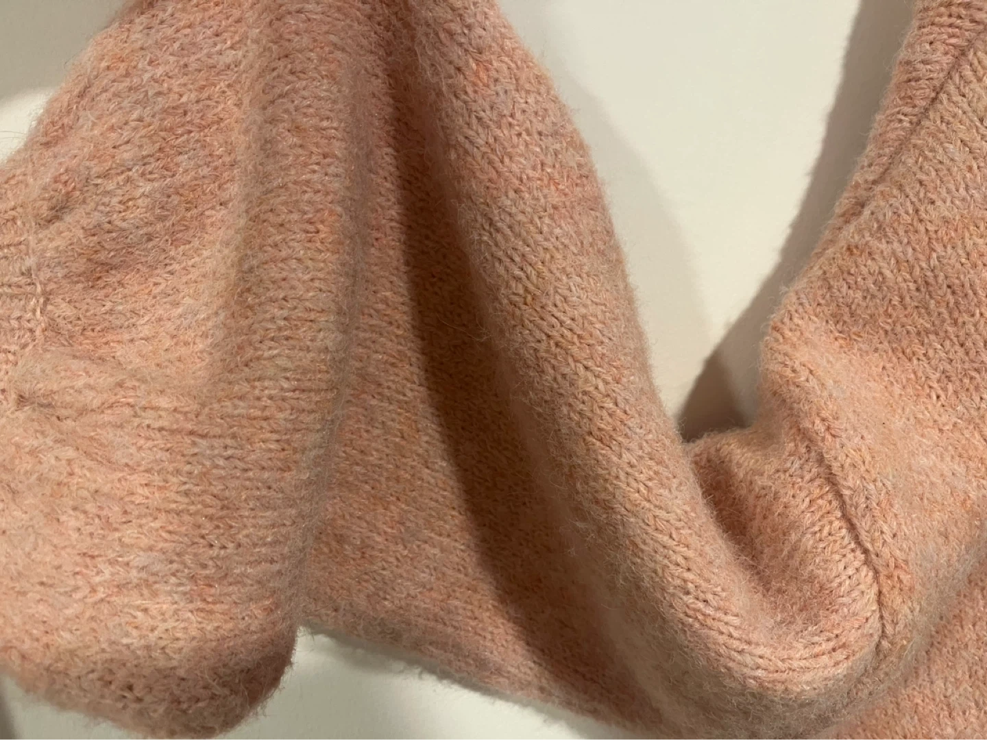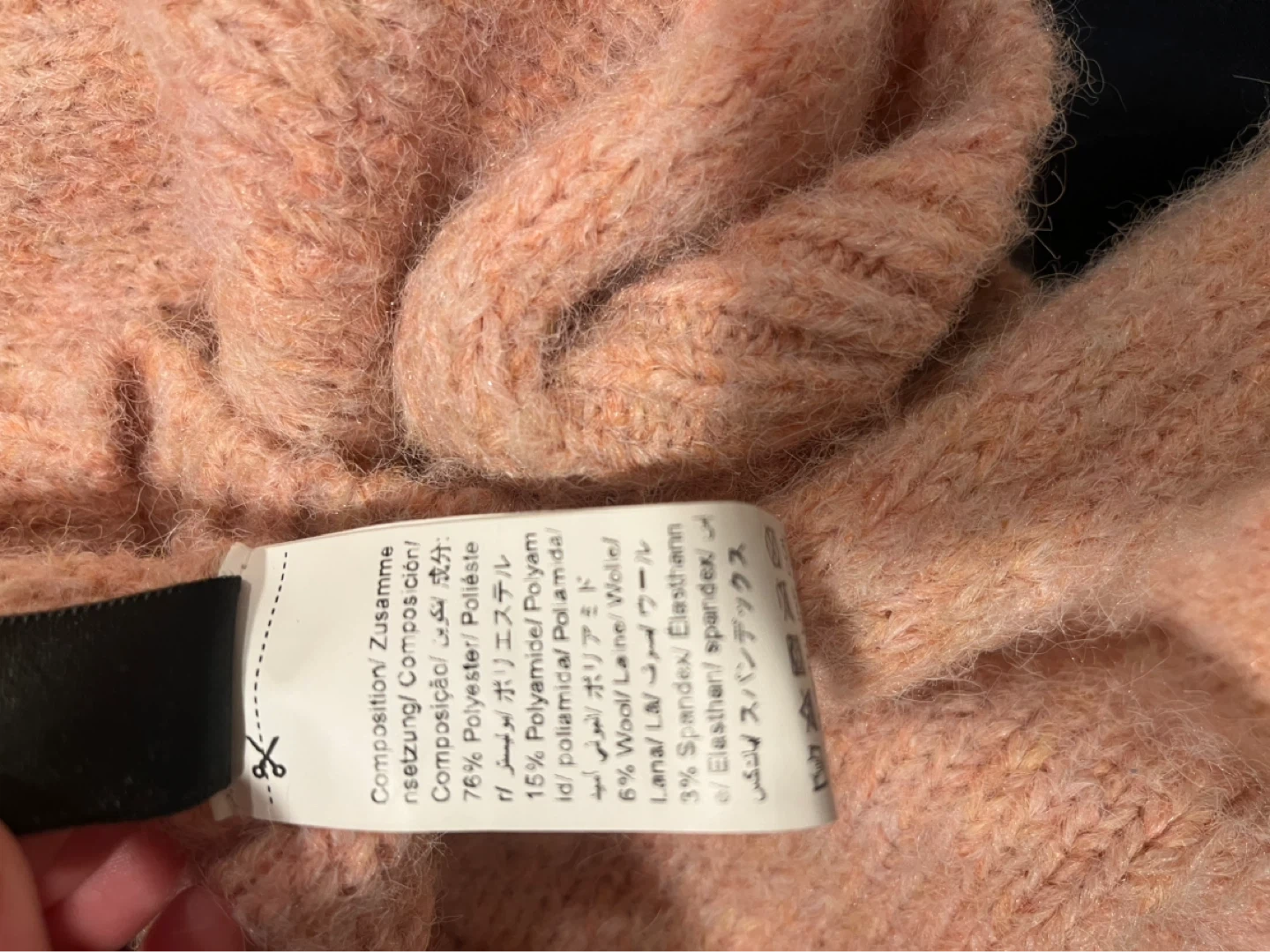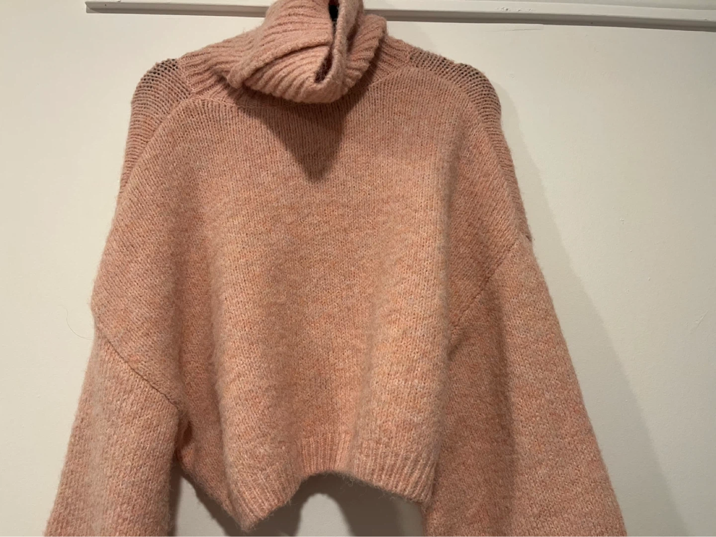 This is a Dazy turtleneck sweater in a light pink colour. Made with 6% wool and 3% spandex. It's a size large. This sweater is perfect for staying warm and cozy on cooler days!