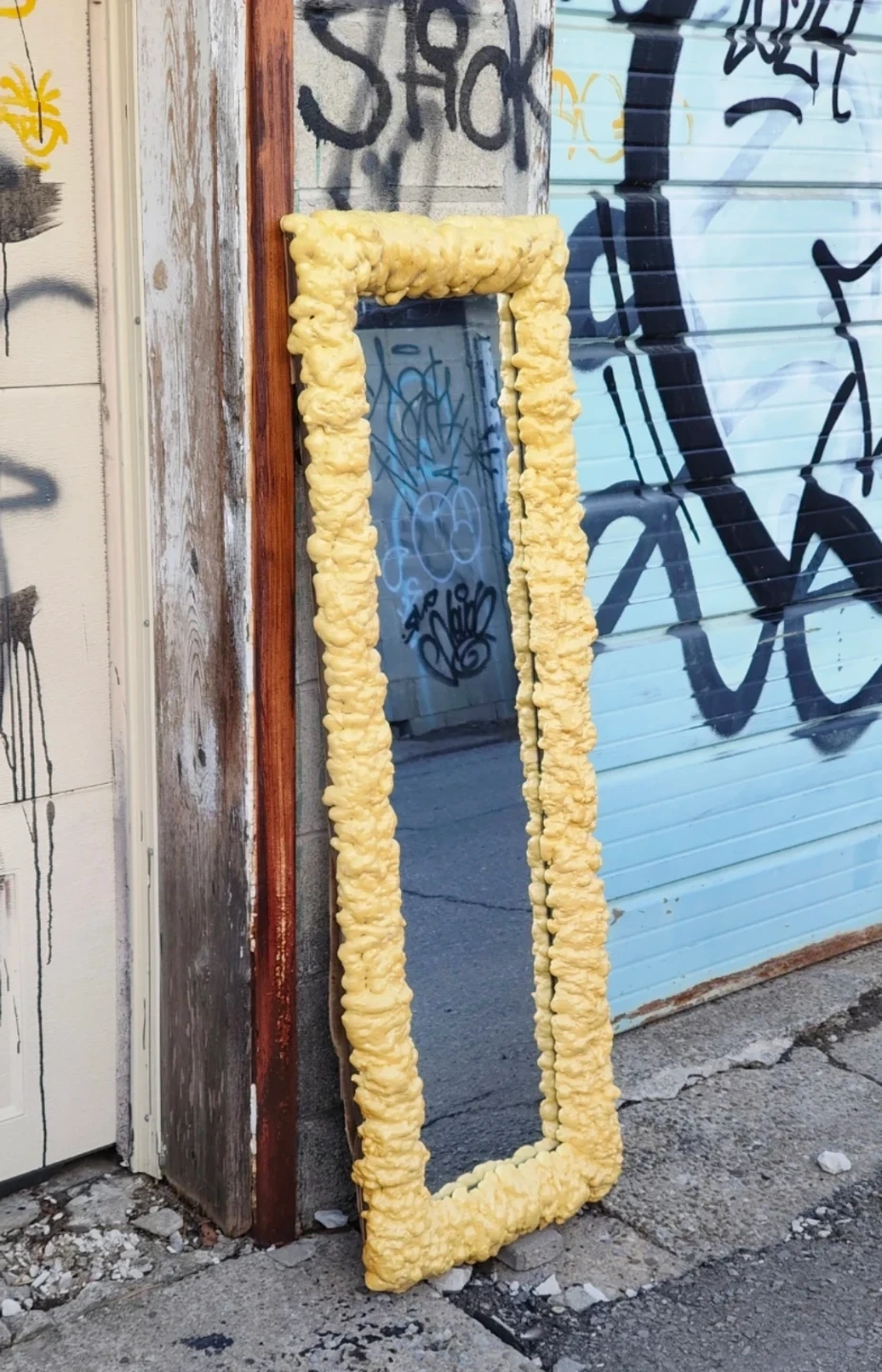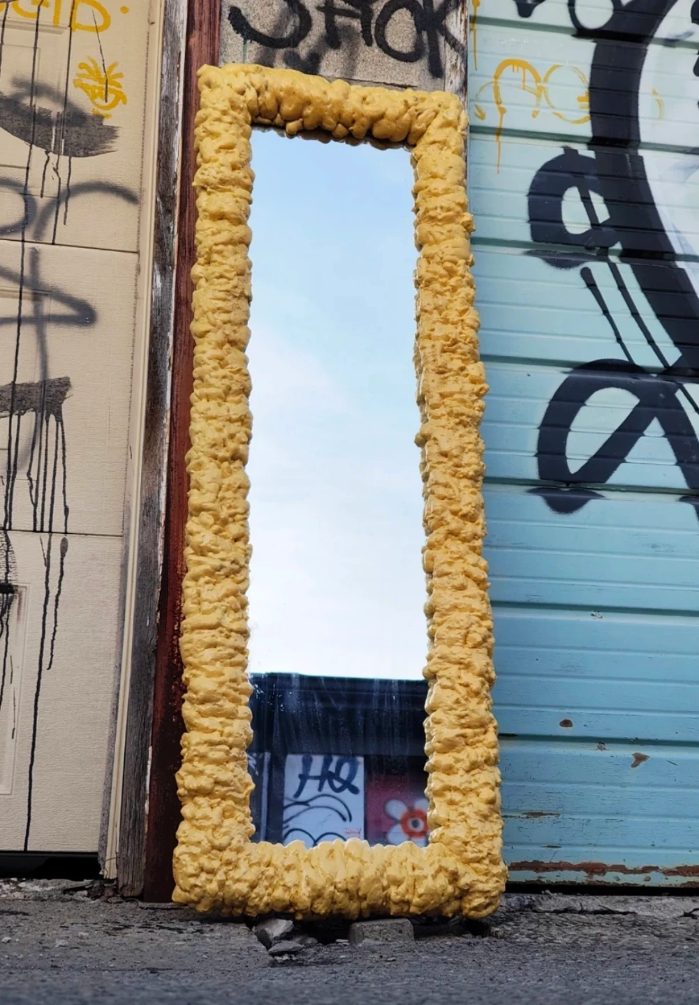 This is a full-length mirror with a distinctive yellow foam frame. The frame is applied over a wooden backing. It's a unique piece that'll make a statement in any room! Adds a quirky touch to your decor.