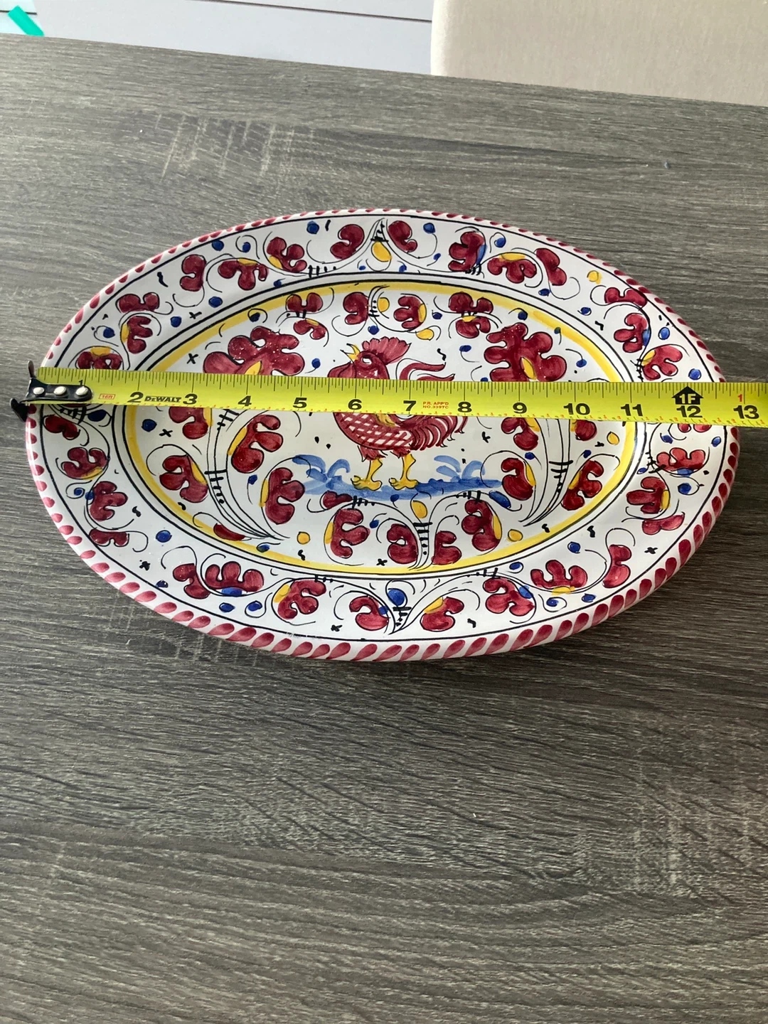 Decorative oval platter featuring a vibrant hand-painted rooster design. Ceramic construction. Measures approximately 13 inches long.