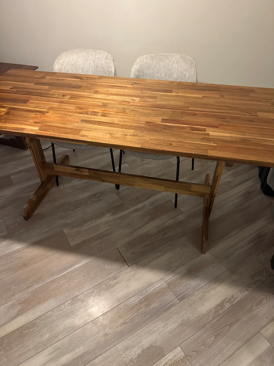 A sturdy solid wood dining table with a natural finish. It's made of durable hardwood planks. This table seats six people comfortably.