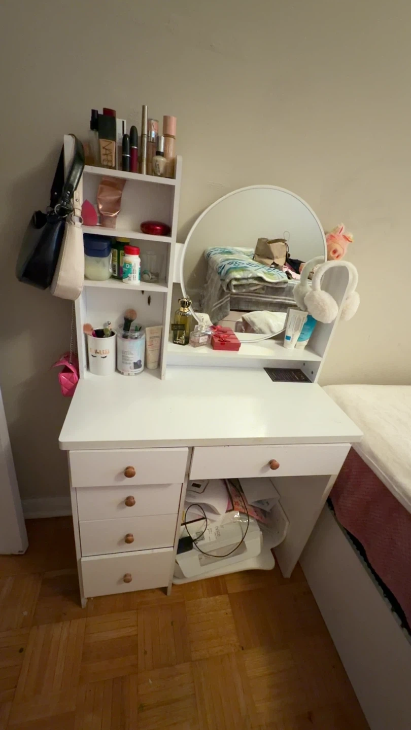 White vanity desk featuring a built-in mirror and shelving. It includes drawers for storage and a side compartment. This desk offers a dedicated space for makeup and accessories.
