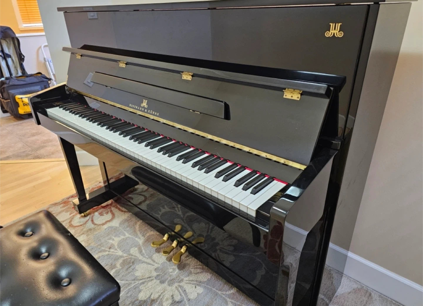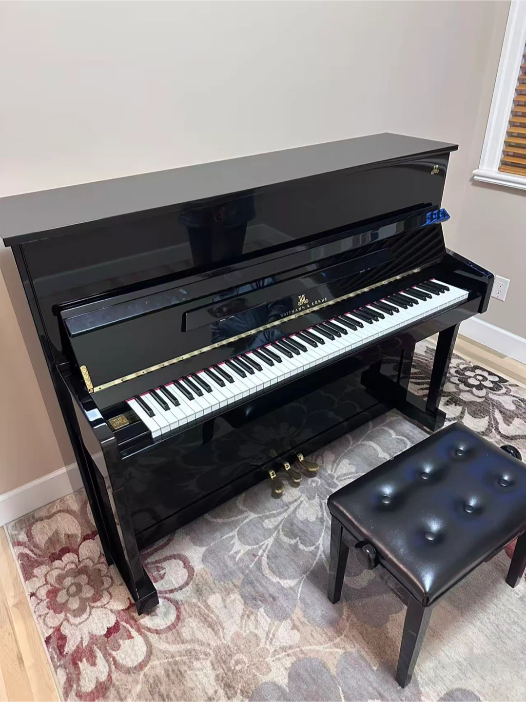 Hoffmann & Kühne upright piano. It's a black, polished finish. Includes matching bench. Great for music students!