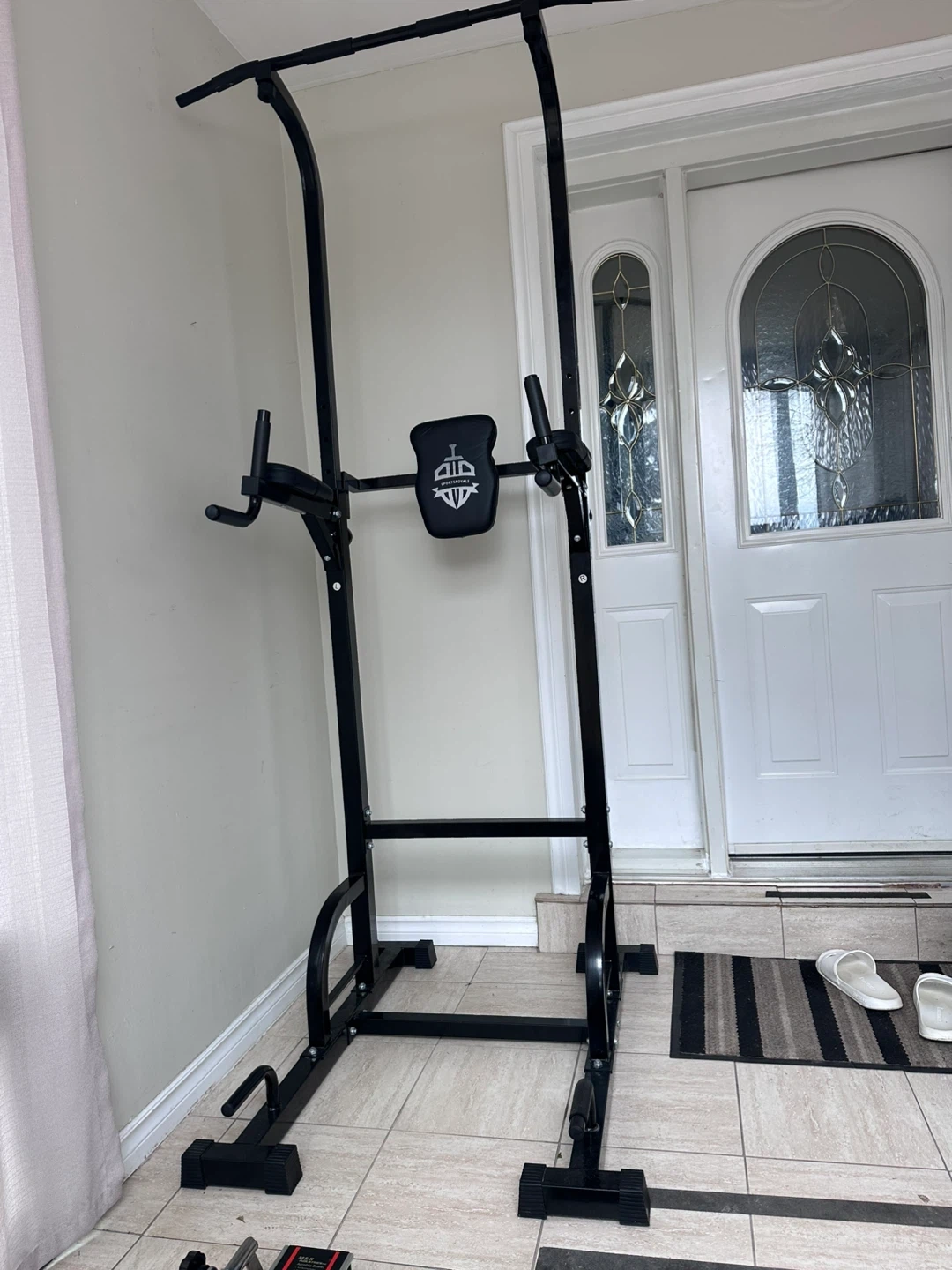 This black pull-up and dip station tower is a versatile piece of home gym equipment. It's constructed from durable steel for stability. This tower offers multiple workout stations for a full-body routine.