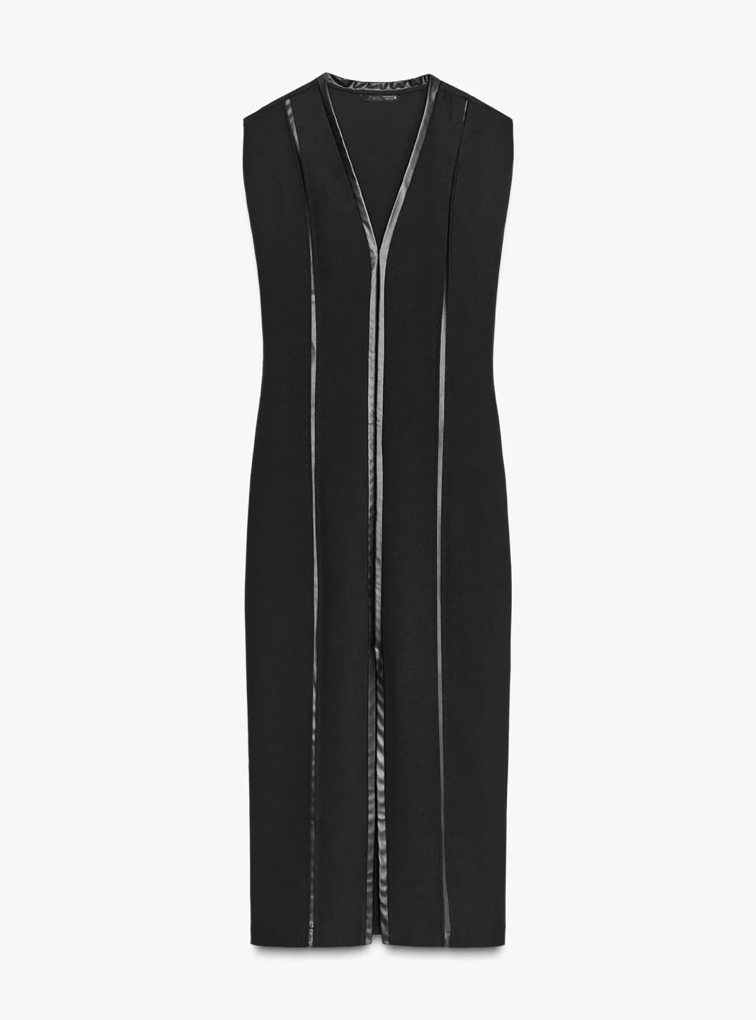 A stylish black sleeveless dress featuring faux leather trim details. It has a V-neckline and a front slit for added flair. This dress offers a sleek silhouette perfect for dressing up.