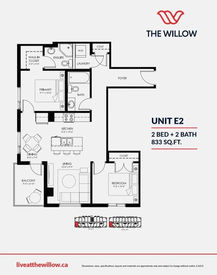 The specific suite is Plan E2, a 2-bedroom unit with 833 sq. ft. It features luxury vinyl plank flooring, 9-foot ceilings, contemporary lighting, air conditioning, in-suite laundry, and a terrace or balcony.