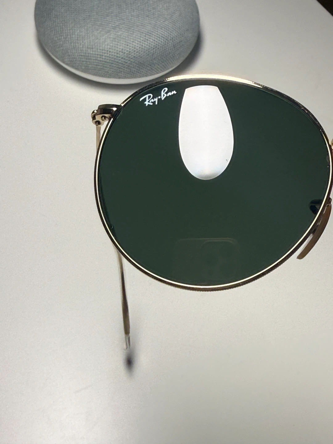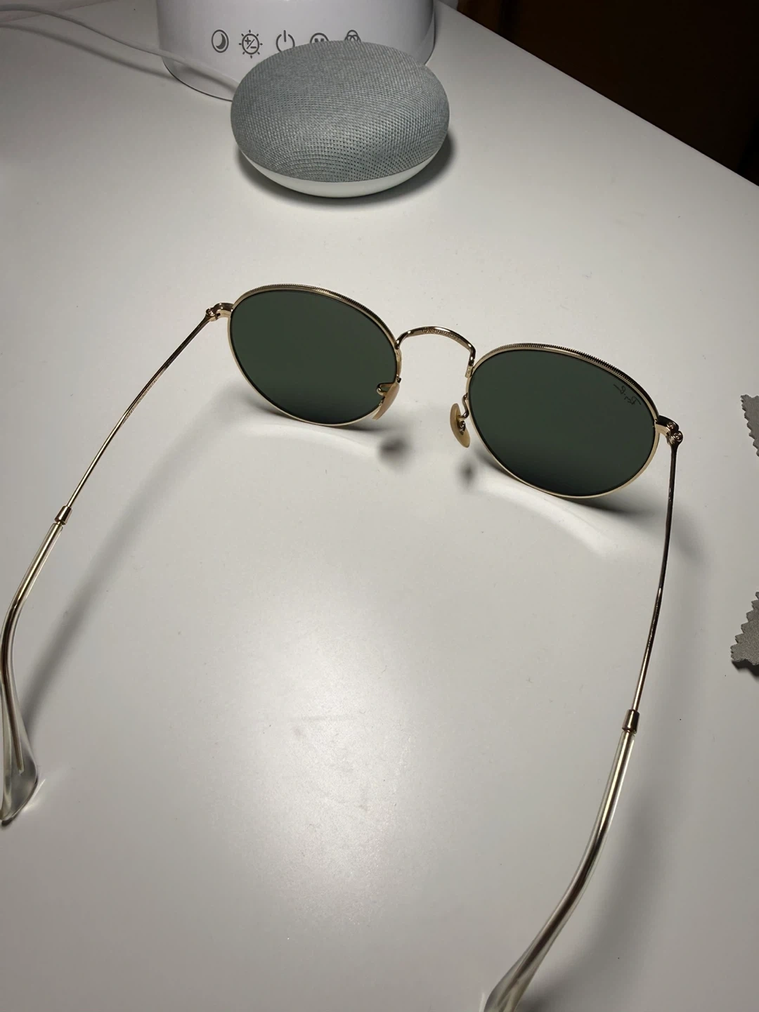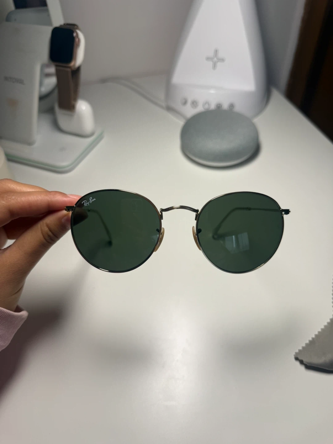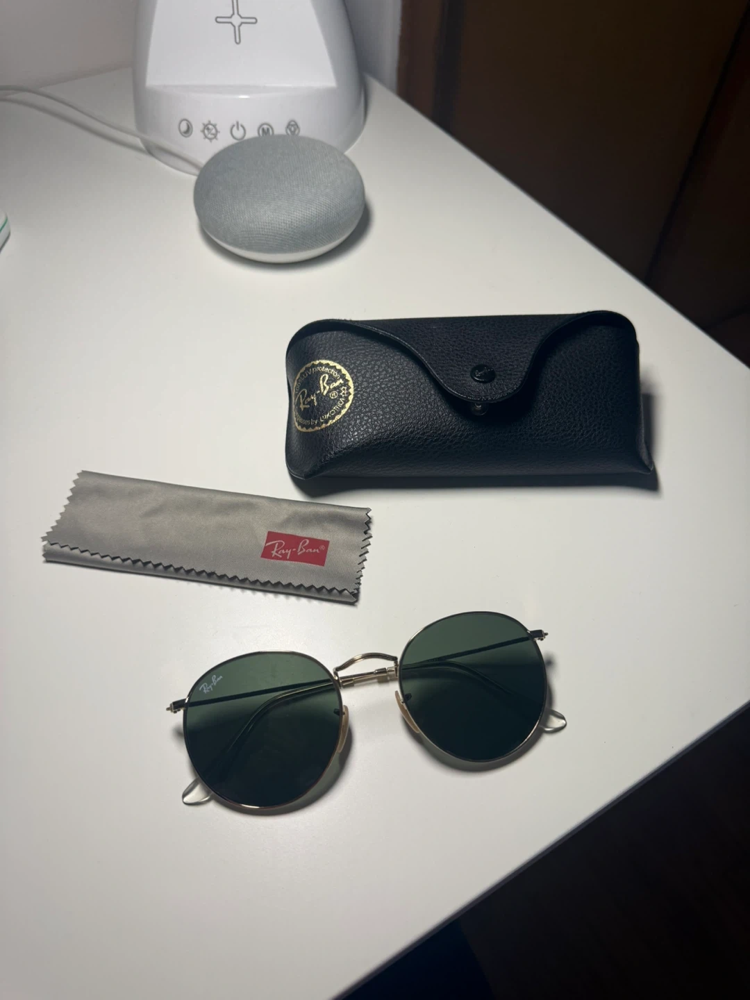 Classic gold-tone Ray-Ban Round Metal sunglasses. Featuring green lenses and a metal frame. Includes original case, cleaning cloth, and box. Made in Italy.