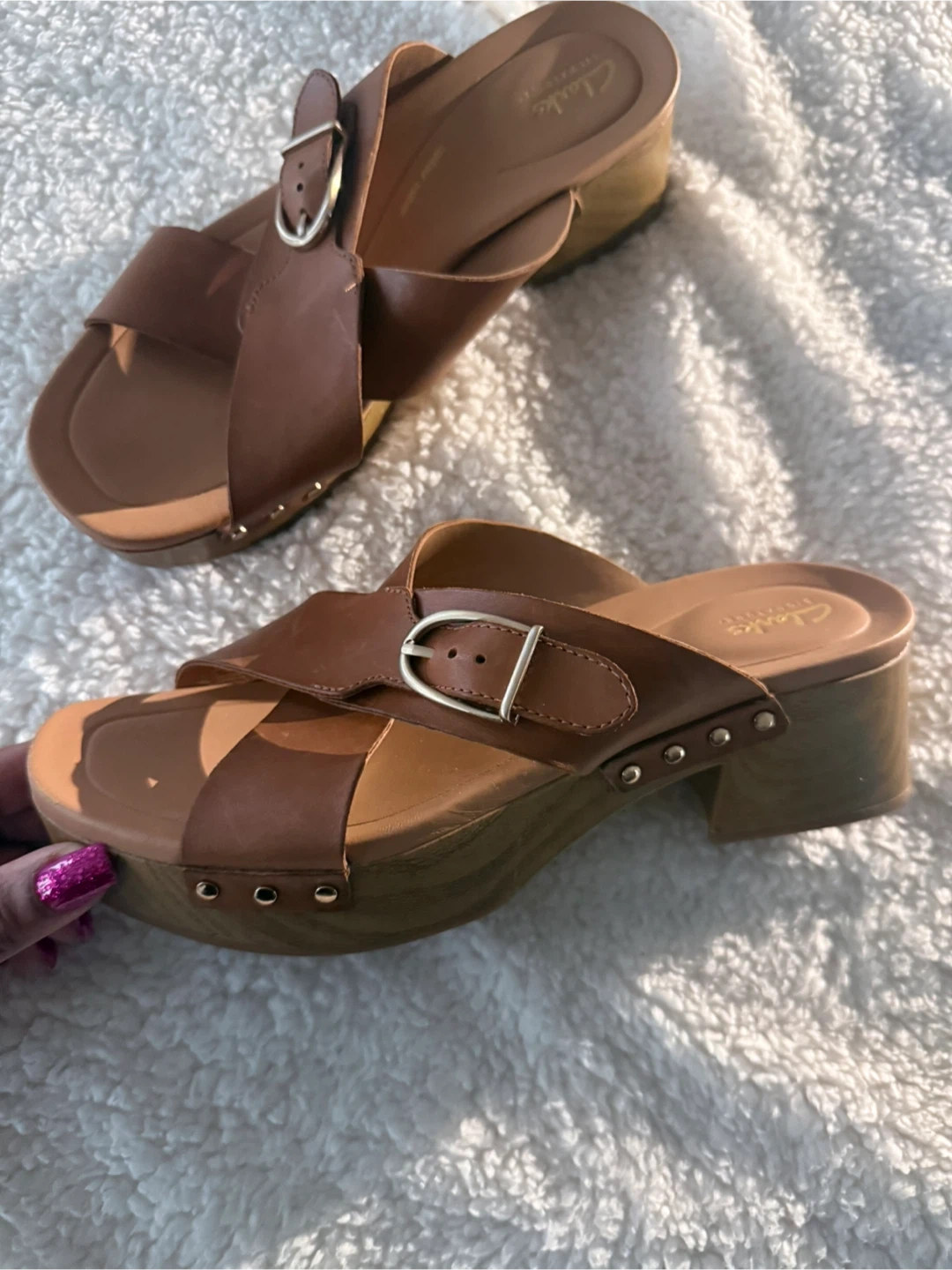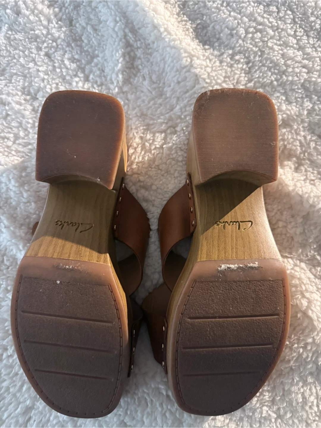 These are Clarks brand heeled sandals. They are a brown leather with a buckle and wood-look heel. They are in good condition and ready for a new home!
