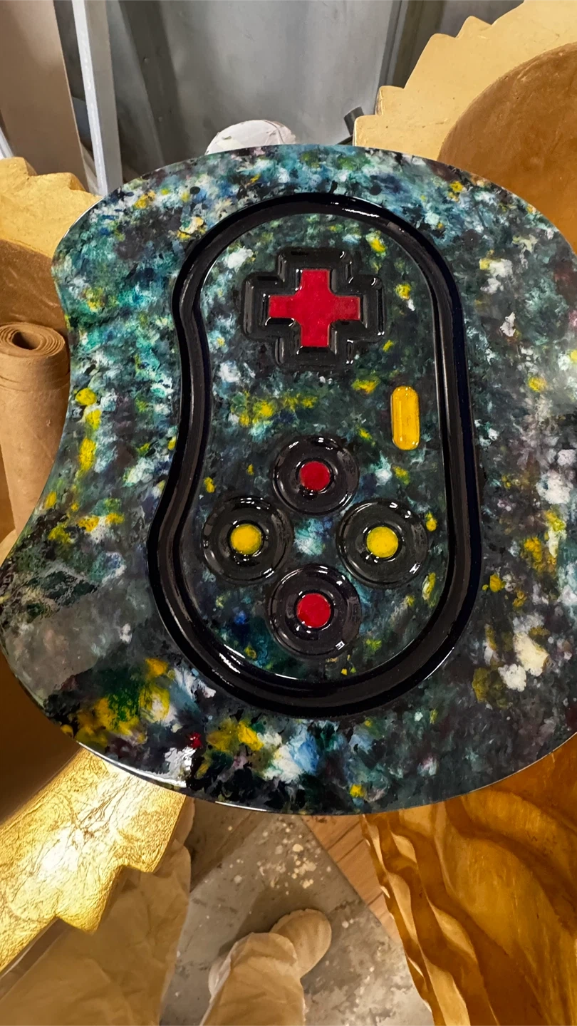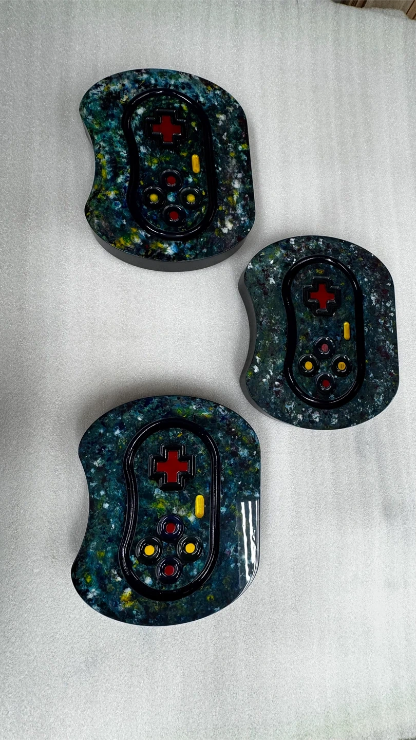 Unique set of three decorative game controller pieces. They're made from resin with a marbled green and multi-color finish. Each piece resembles a classic video game controller with buttons and a directional pad. WOOD