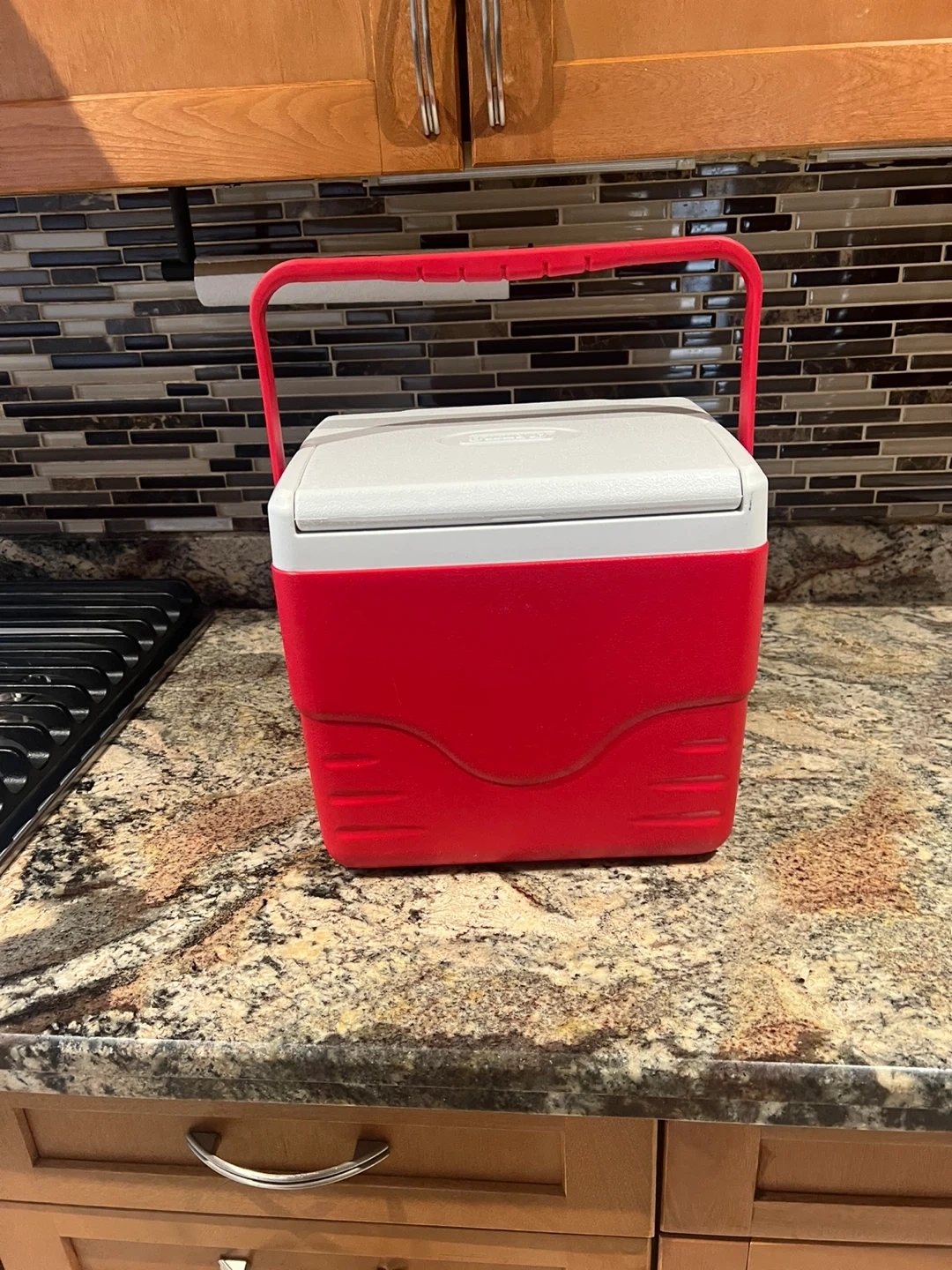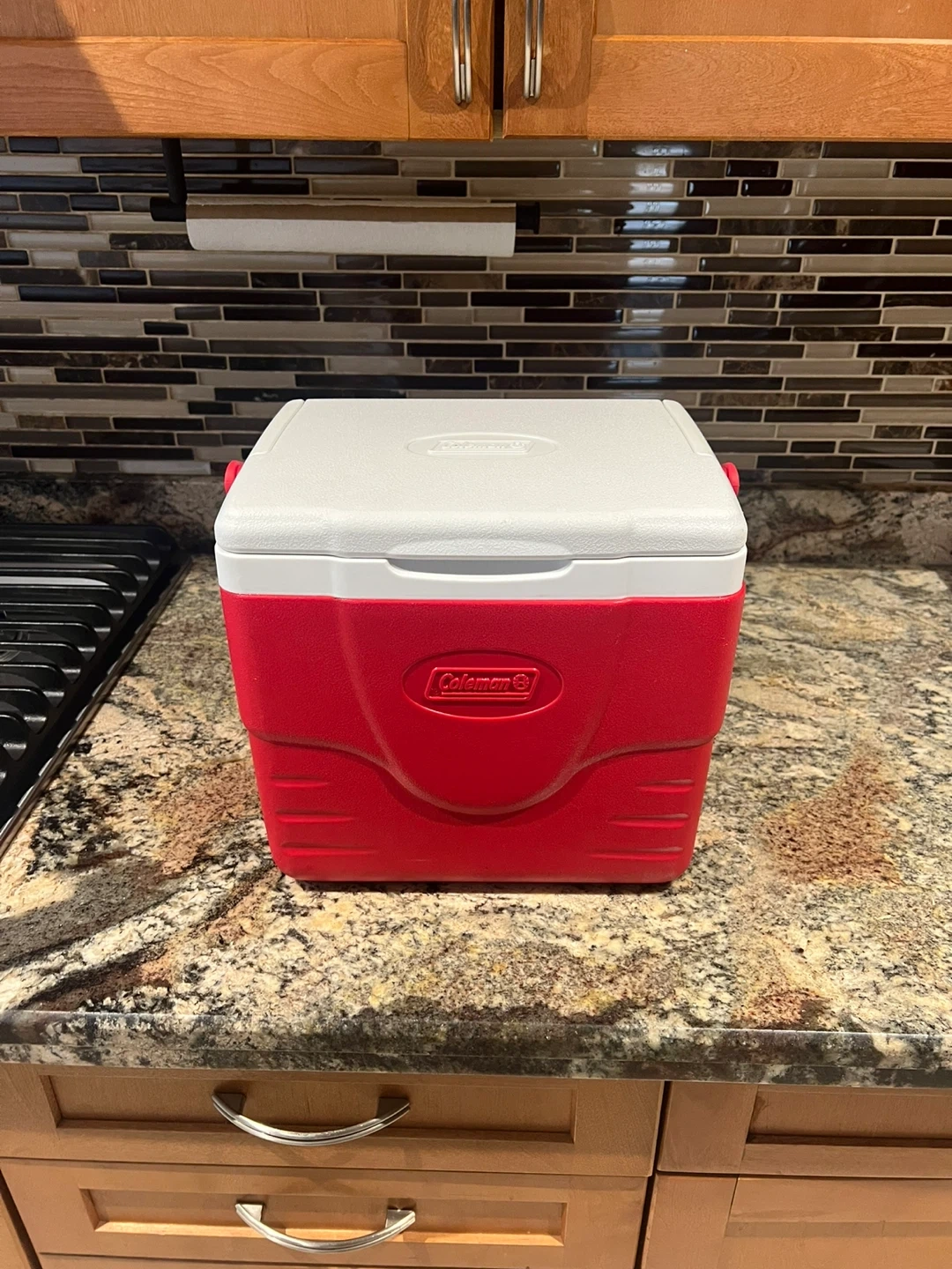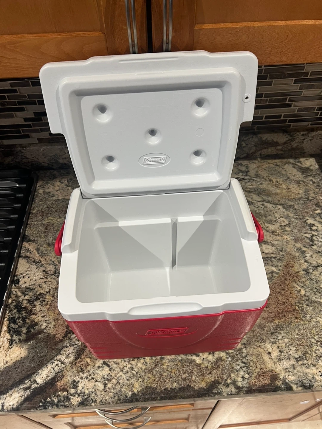 Coleman cooler in red and white. It's a handy size for picnics or day trips. Interior is divided for organization. Handle folds down for easy storage.