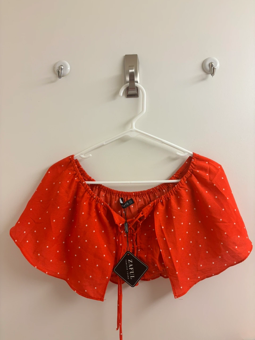 This is a cute Zaful top with a red and white polka dot pattern. It's an off-the-shoulder style with a lace-up front. The fabric feels lightweight and breathable. It's a fun piece for warmer weather!