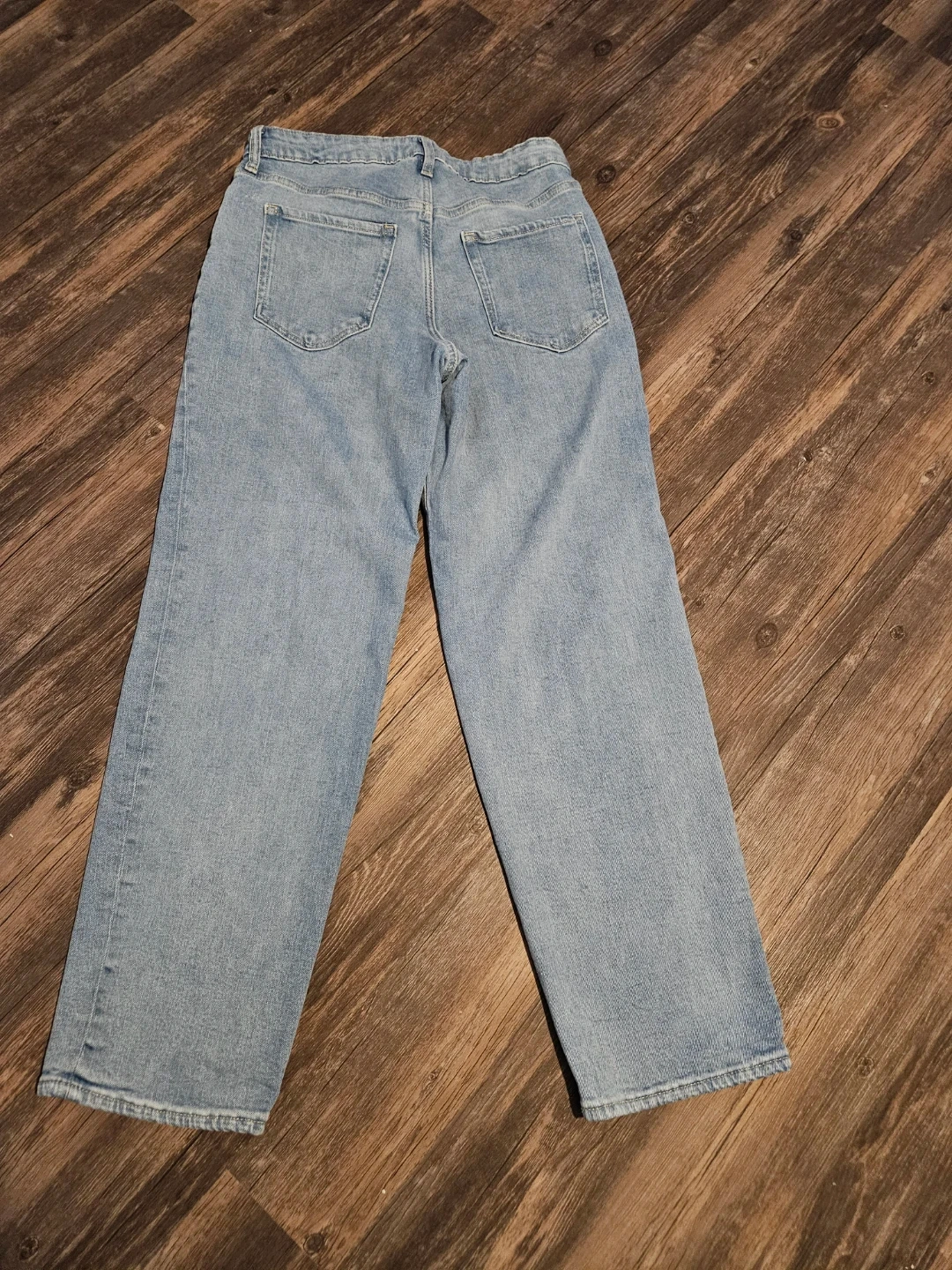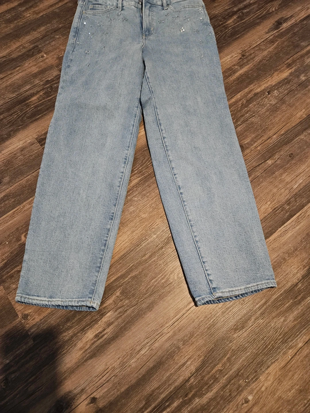 These are light wash Old Navy jeans with a high-waisted, wide-leg fit. They're embellished with scattered sparkly floral details on the front. Size 10. Pick up east mountain. Cash please. Non-smoking.