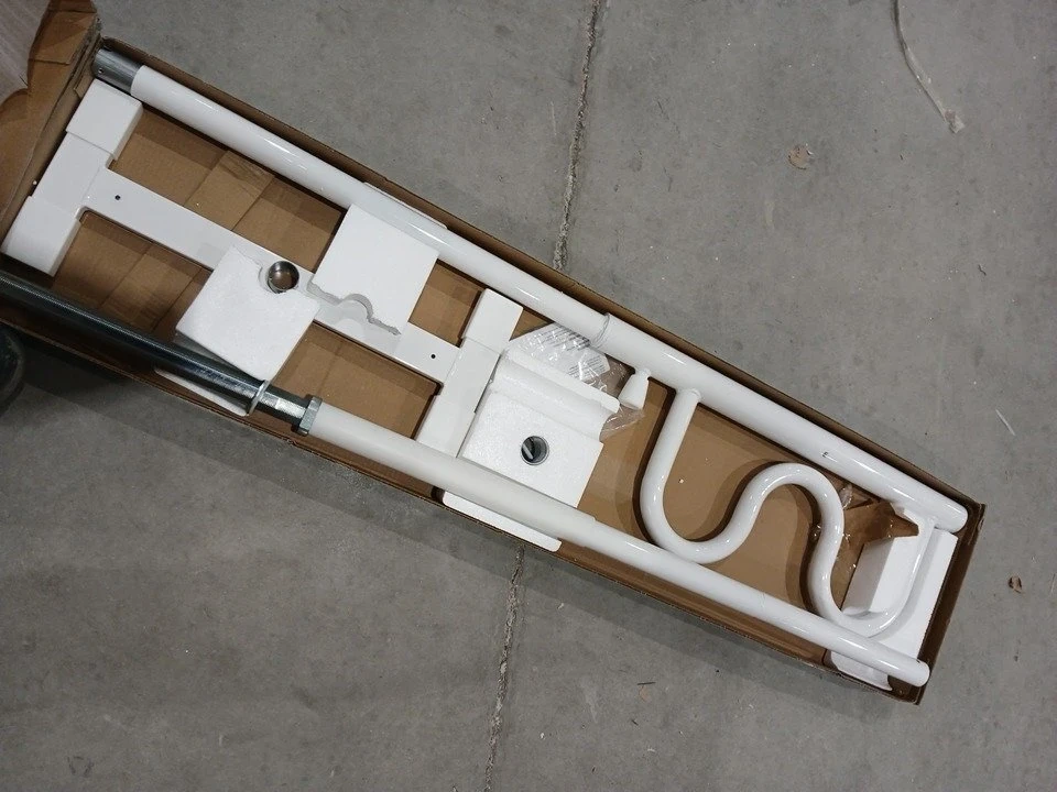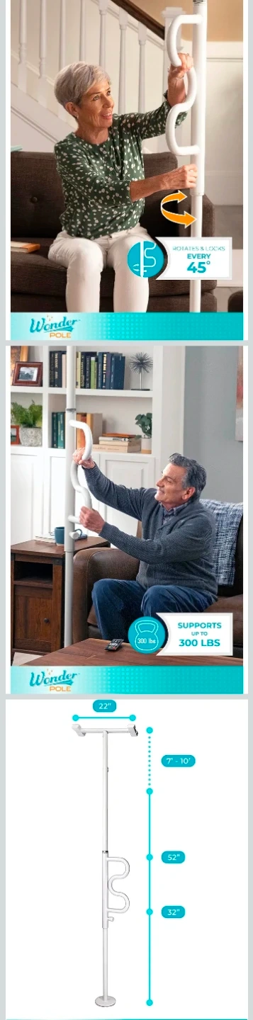 I'm offering a new Stander Wonder Pole, designed to help you stand and sit easier in any room of your home. This security pole and curve grab bar is tension mounted from floor to ceiling, fitting ceilings from 7 to 10 feet tall. It's an excellent bathroom safety assist and stability rail.