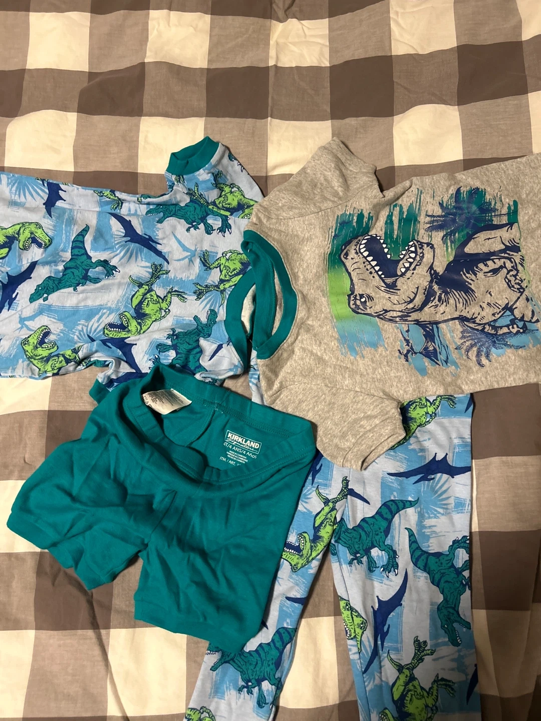 Selling a cute Kirkland brand pajama set for kids! The set features a fun dinosaur print and is size 4T. Perfect for your little one's bedtime routine. They are never washed or worn with the string on.