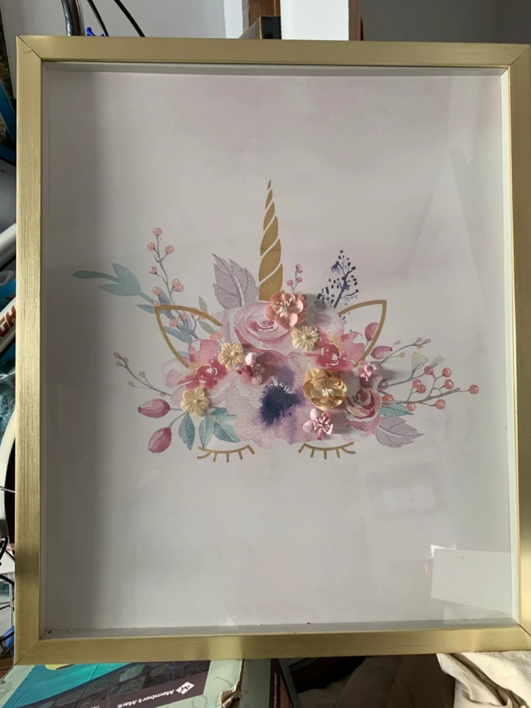 This shadow box features a lovely unicorn design with colourful floral accents. It has a gold-toned frame and a white backing. It's a whimsical piece for any room!