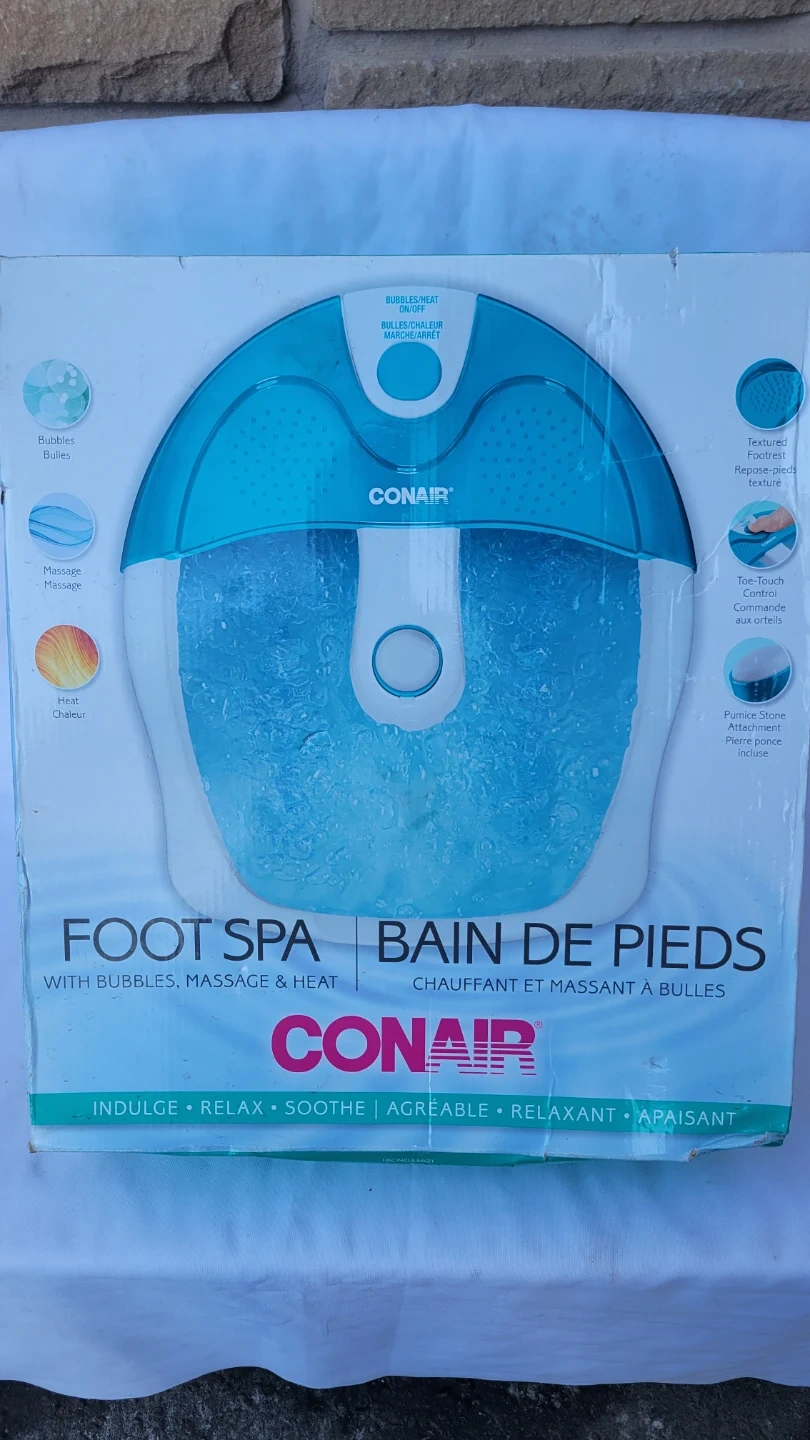 This Brand New Conair foot spa offers bubbles, massage, and heat functions. It includes a textured footrest and a pumice stone attachment. Toe-touch controls make operation easy.
