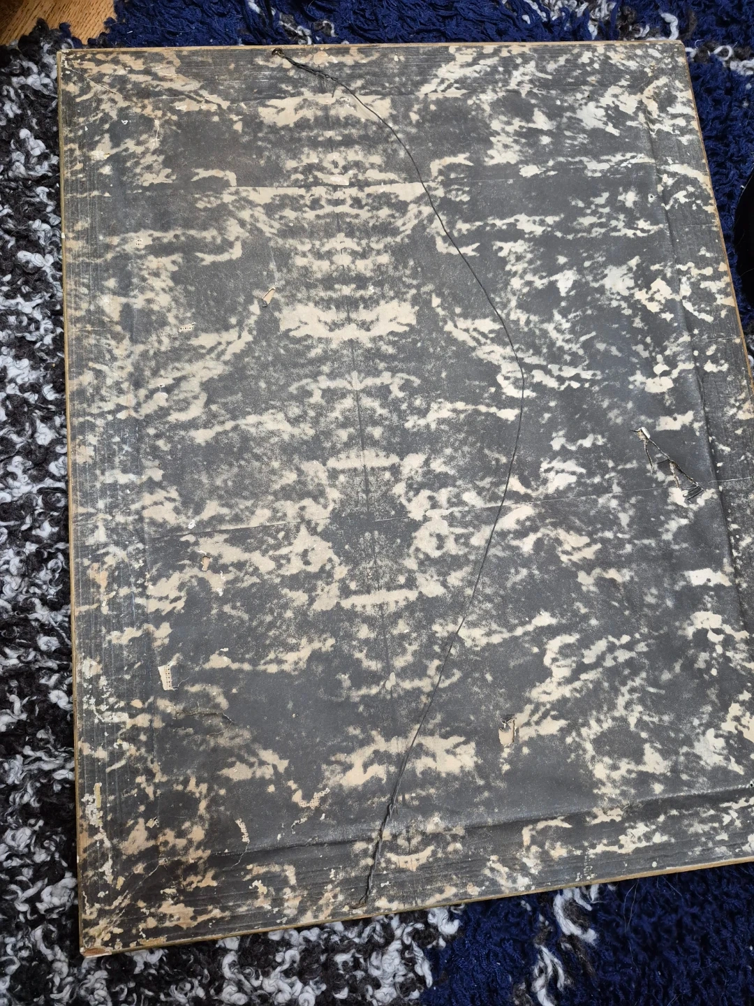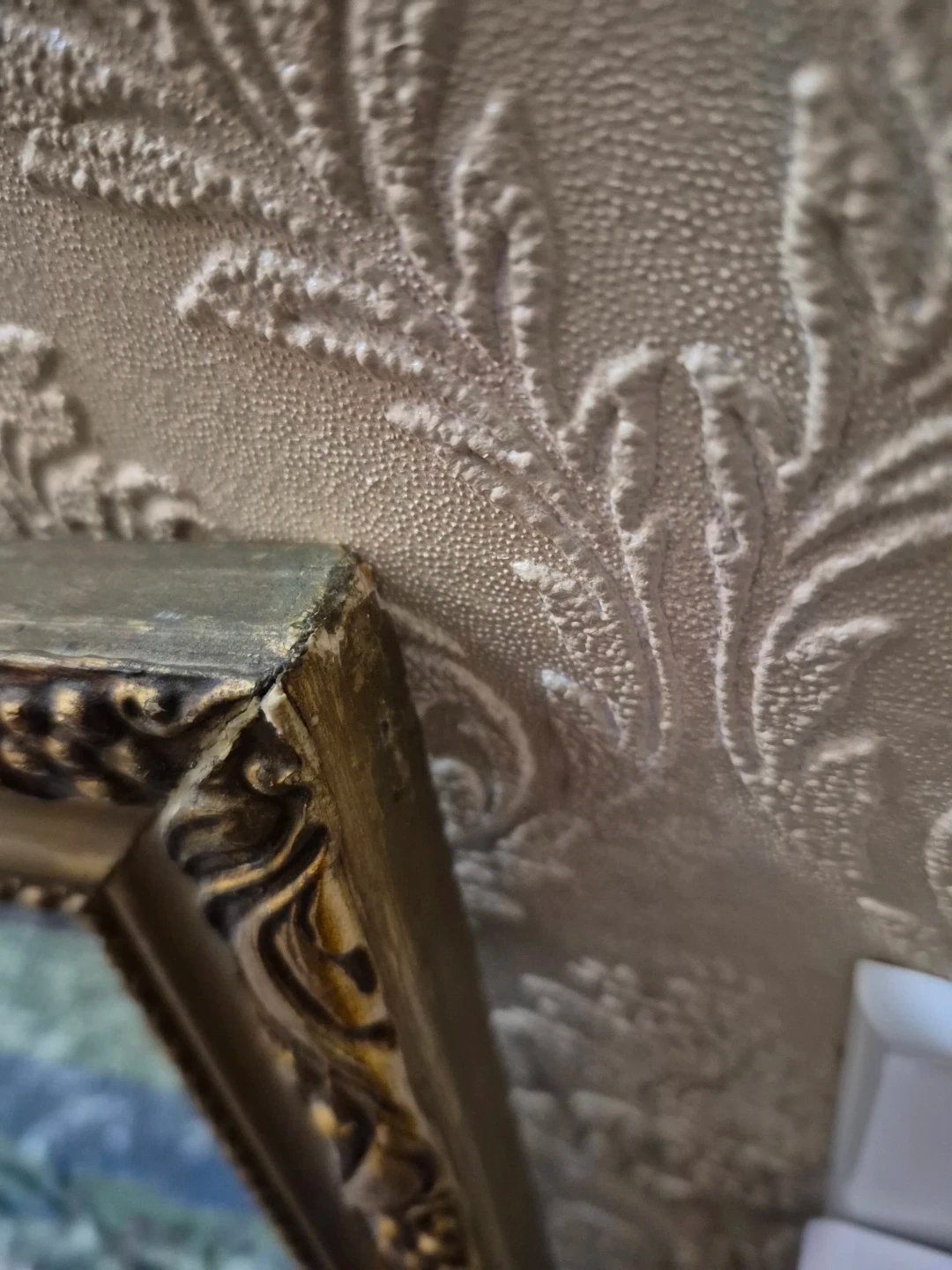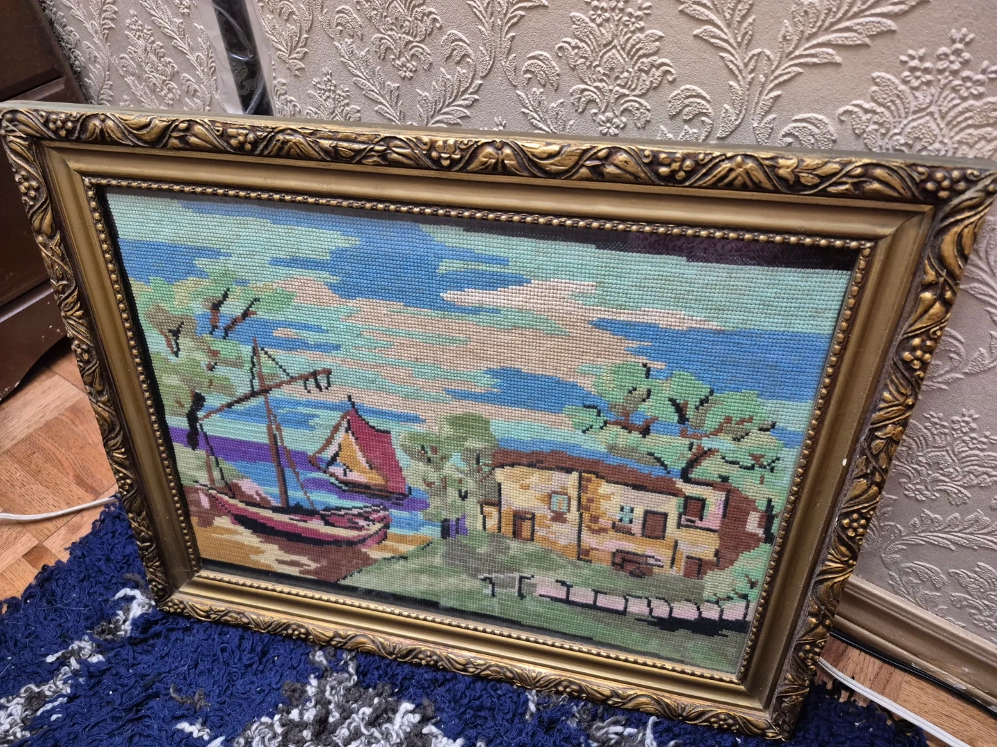 Charming vintage framed tapestry artwork depicting a colourful coastal scene with a sailboat and buildings. It's a detailed needlepoint piece. This wall art would add a touch of classic decor to any room.