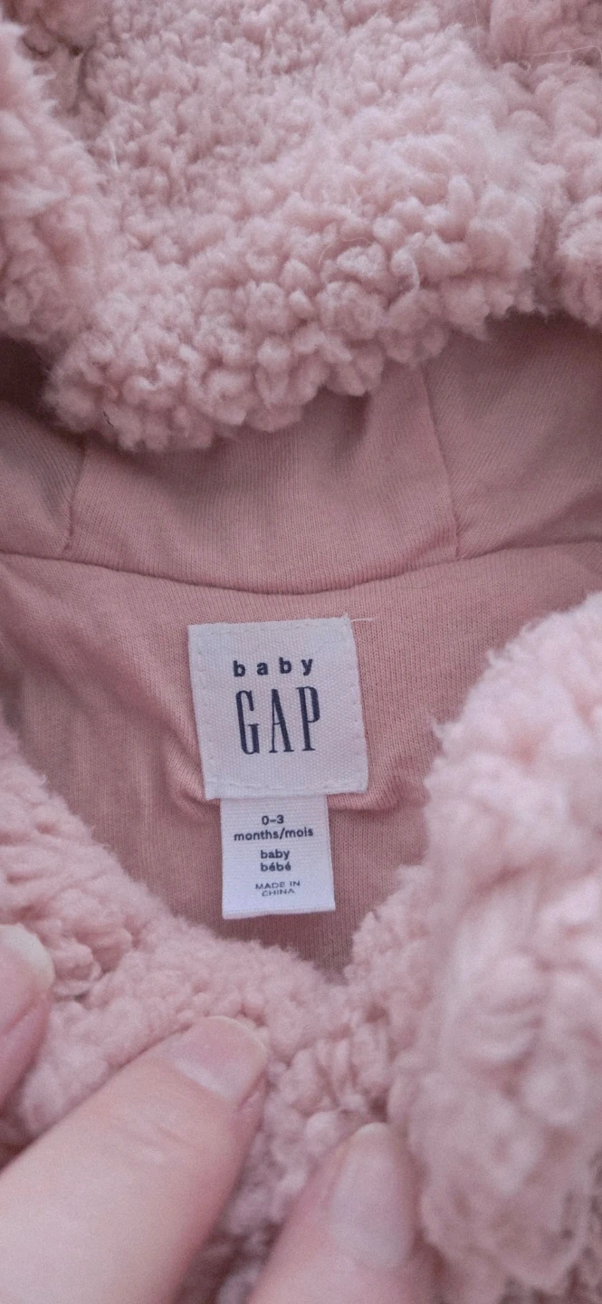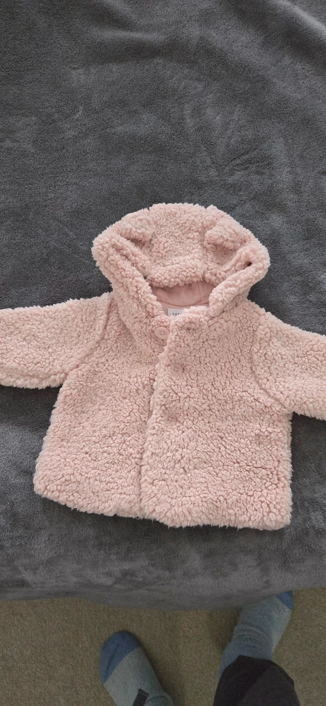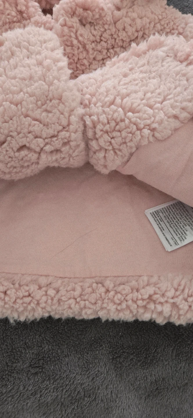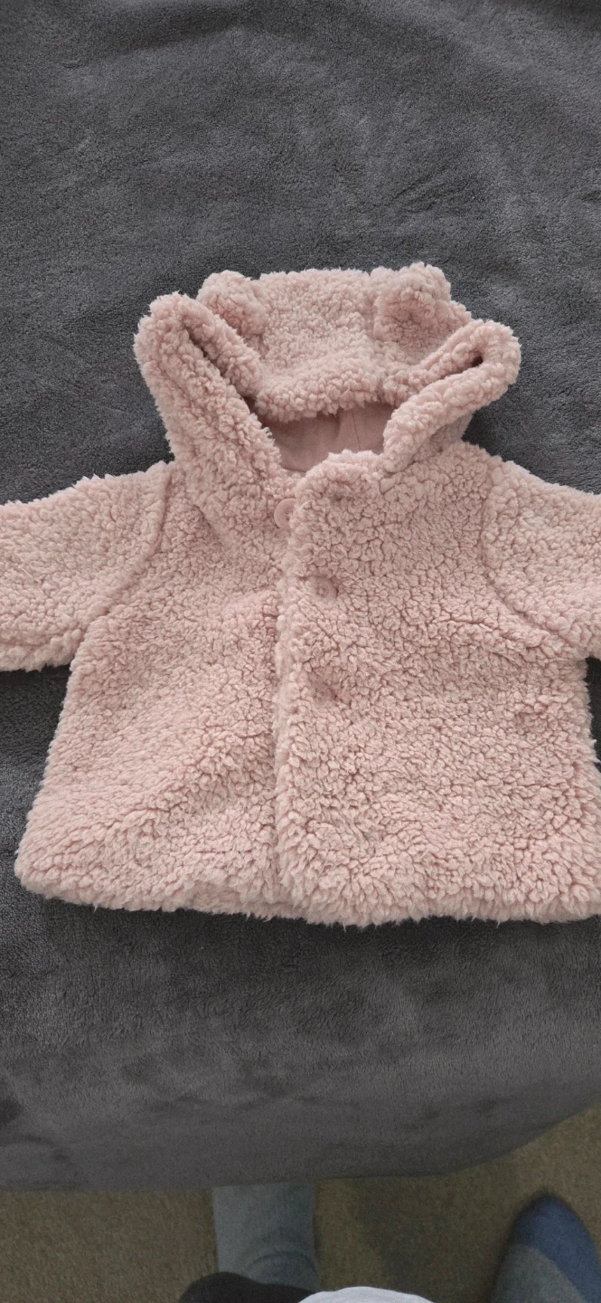 Cute and cozy dusty rose sherpa jacket with bear ear hood. It's a size 0-3 months. Perfect for keeping your little one warm during cooler weather!