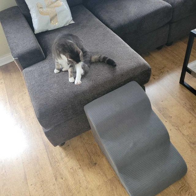 Give your furry friend a helping hand with these Aodisman dog stairs! These convenient stairs are designed to assist small or elderly dogs in reaching sofas, beds, or chairs with ease. As shown in the pictures, the stairs are in used condition but have been well-maintained. They feature a soft, plush covering for added comfort and a sturdy construction for stability. Specifications: Brand: Aodisman, Type: Dog Stairs, Colour: Gray, Number of Steps: 3, Features: Lightweight and portable. These stairs are ready to step into your pup's life! Can be used by Cats too! Dimensions: 2x1.5x1.5ft. Cash preferred