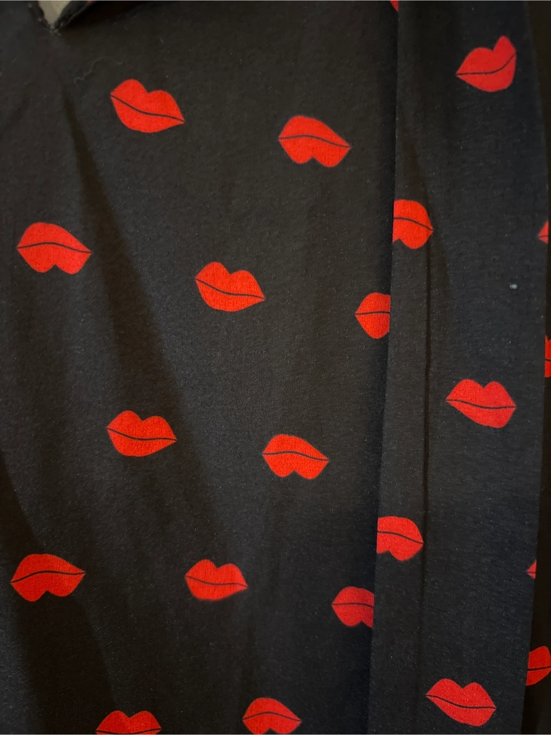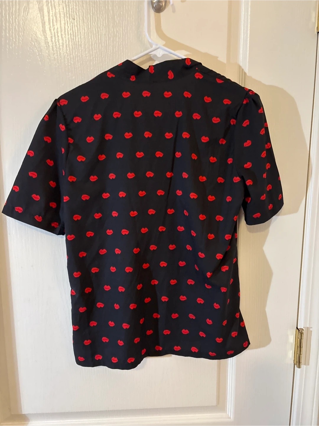 Black short-sleeved blouse with a fun red lips print all over. It has a v-neckline and a tie detail at the neck. Size is L. It's made from a lightweight fabric, perfect for warmer weather! For Valentine’s Day!