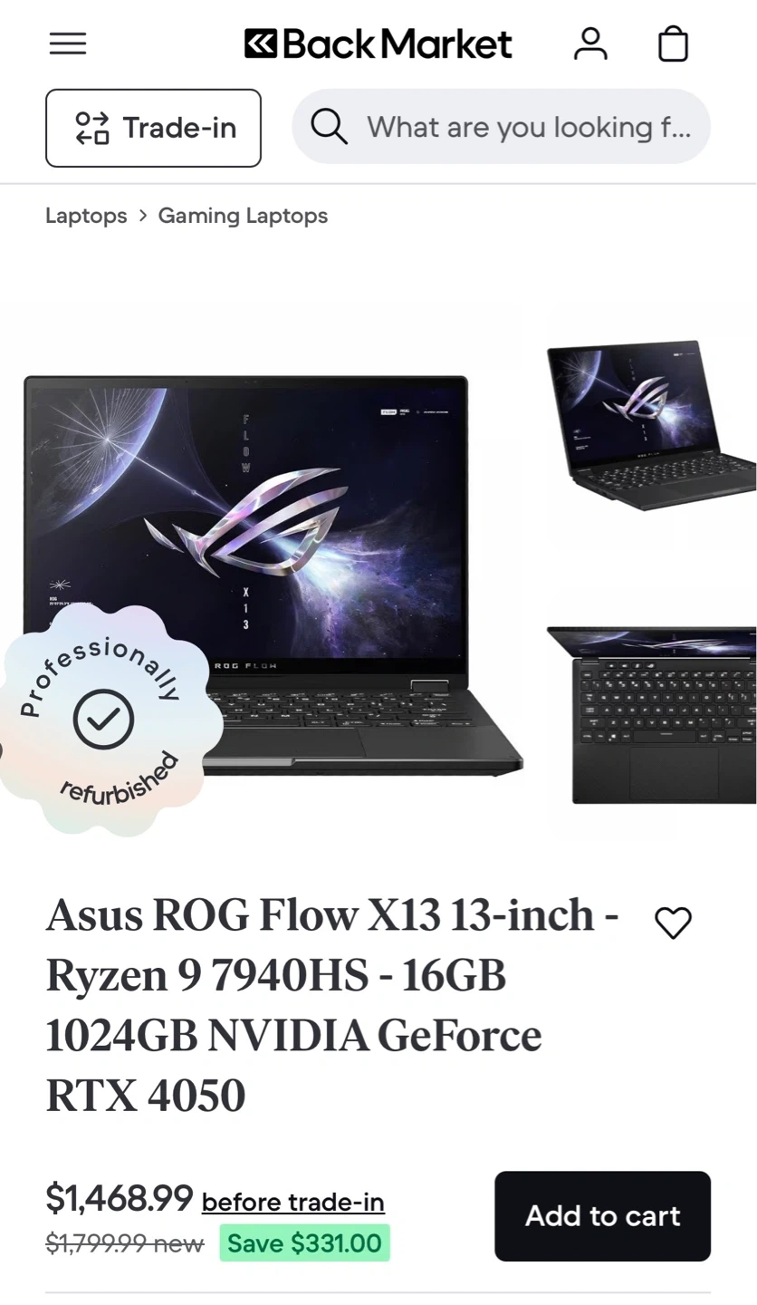 ASUS ROG Flow X13 2-in-1 convertible laptop. Features a 120Hz display. This gaming laptop offers great performance and portability.