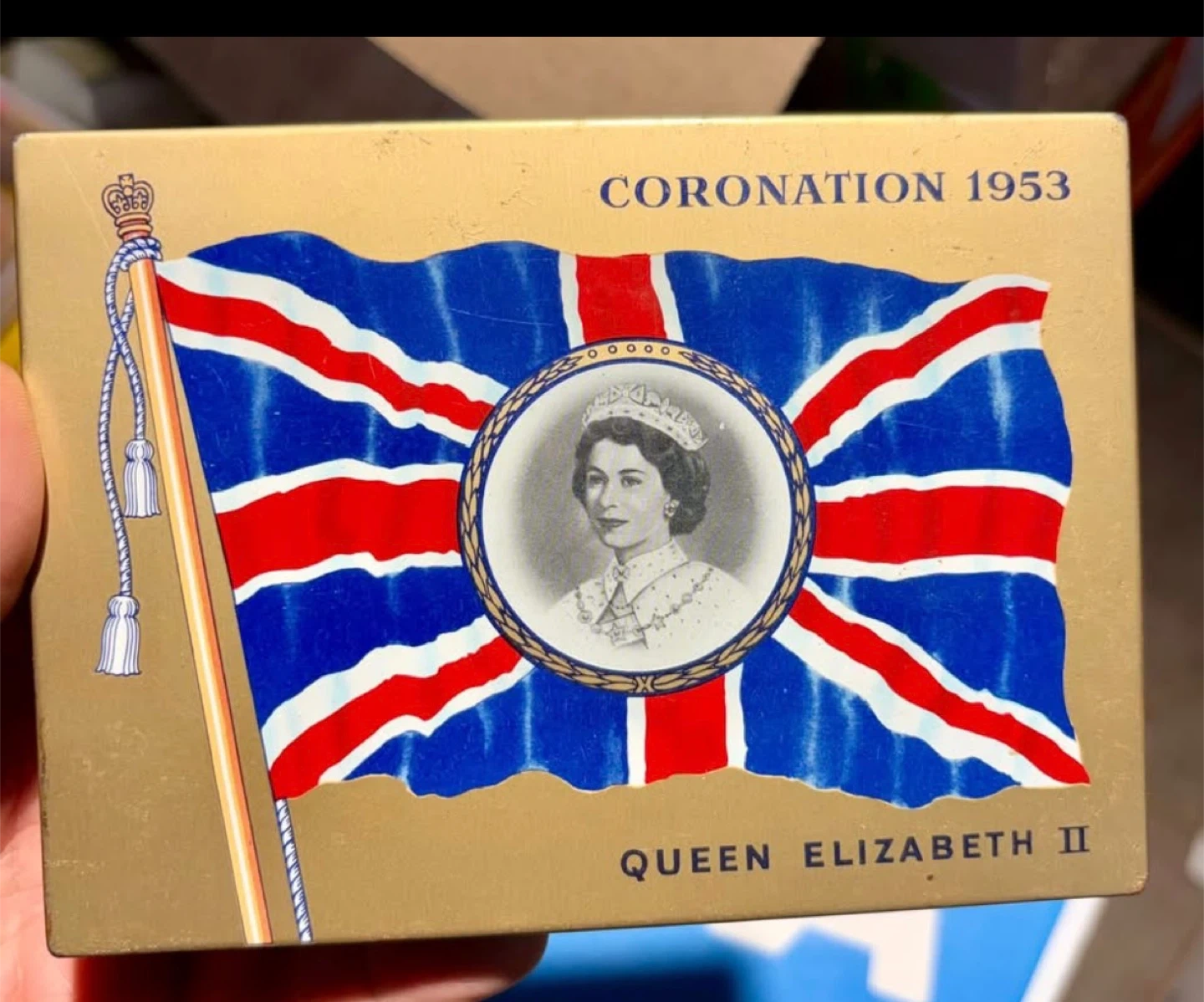 This is a vintage Macdonald's Export cigarette tin commemorating Queen Elizabeth II's Coronation in 1953. It features a Union Jack design with a portrait of the Queen. The tin also has an internal illustration of a Scottish woman and Macdonald's cigarettes.