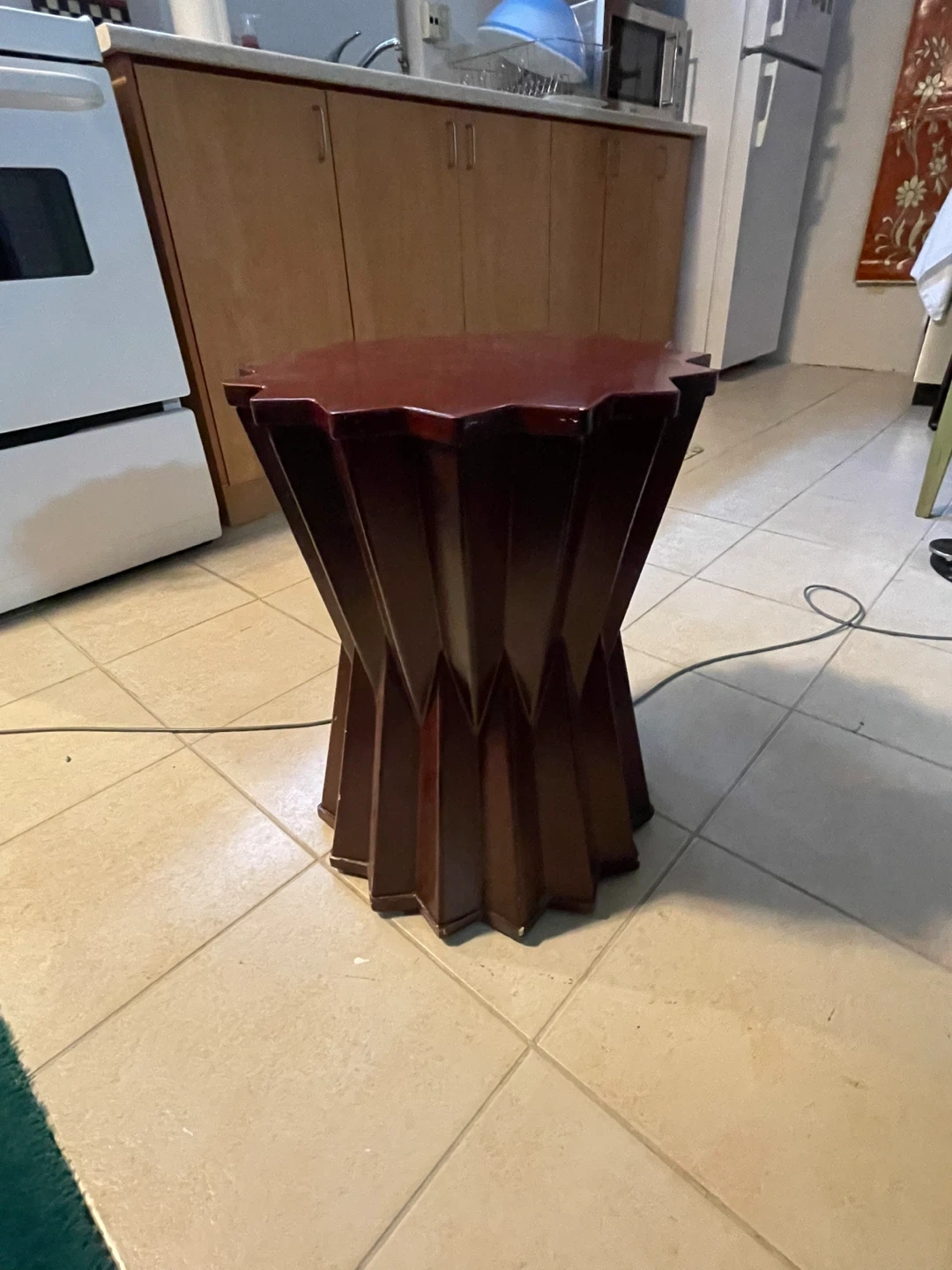A dark red wood octagonal side table with a unique geometric base. It's a sturdy piece suitable for a living room or bedroom. This table adds a stylish touch to any space!