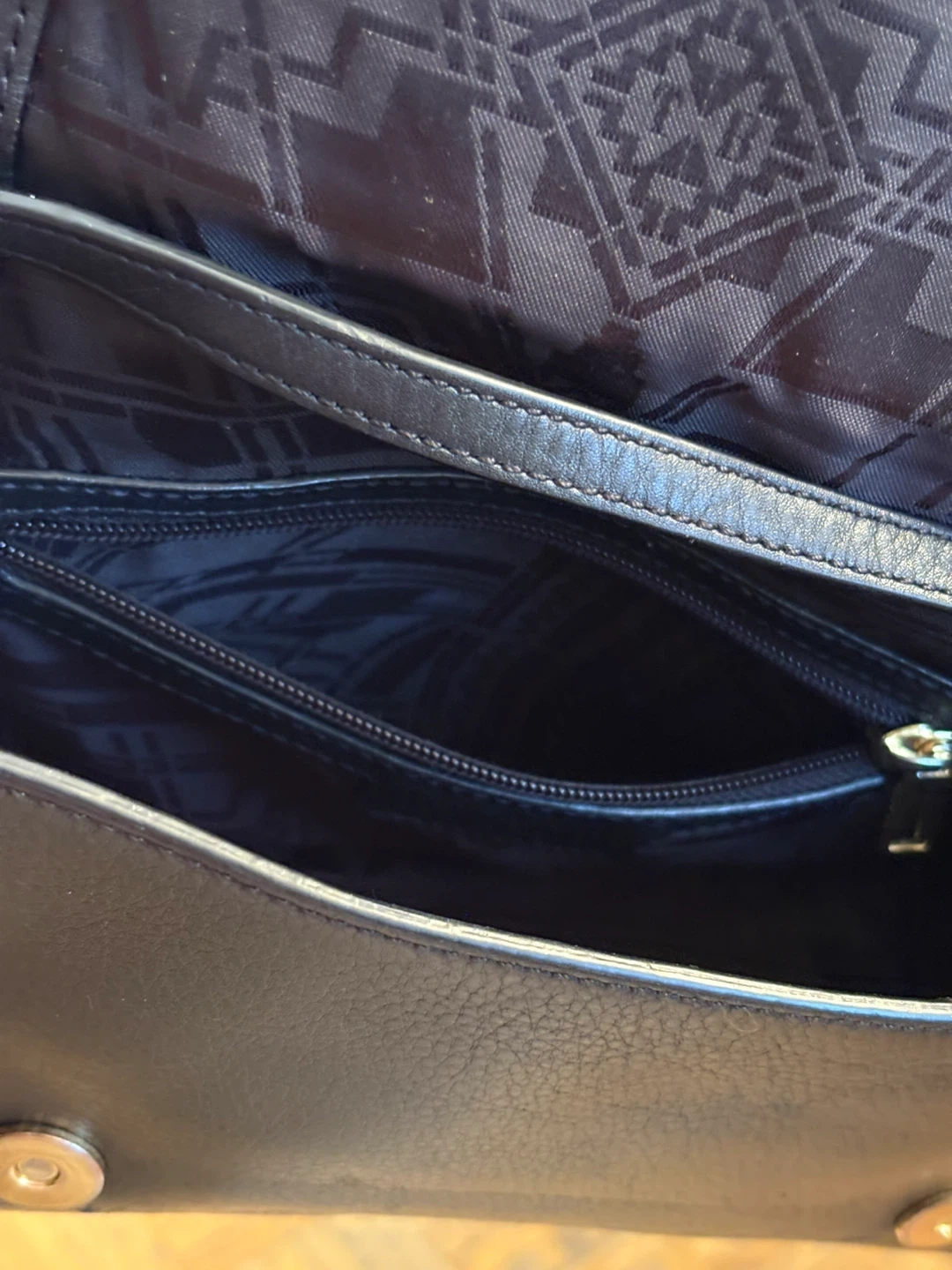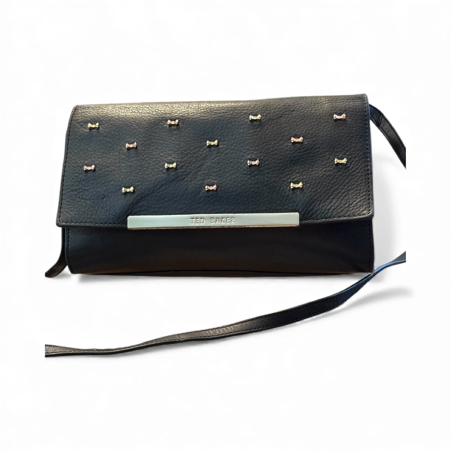 Selling a stylish Ted Baker clutch in black leather. It's in good condition and perfect for evenings out or special occasions. The interior has a cool geometric pattern!