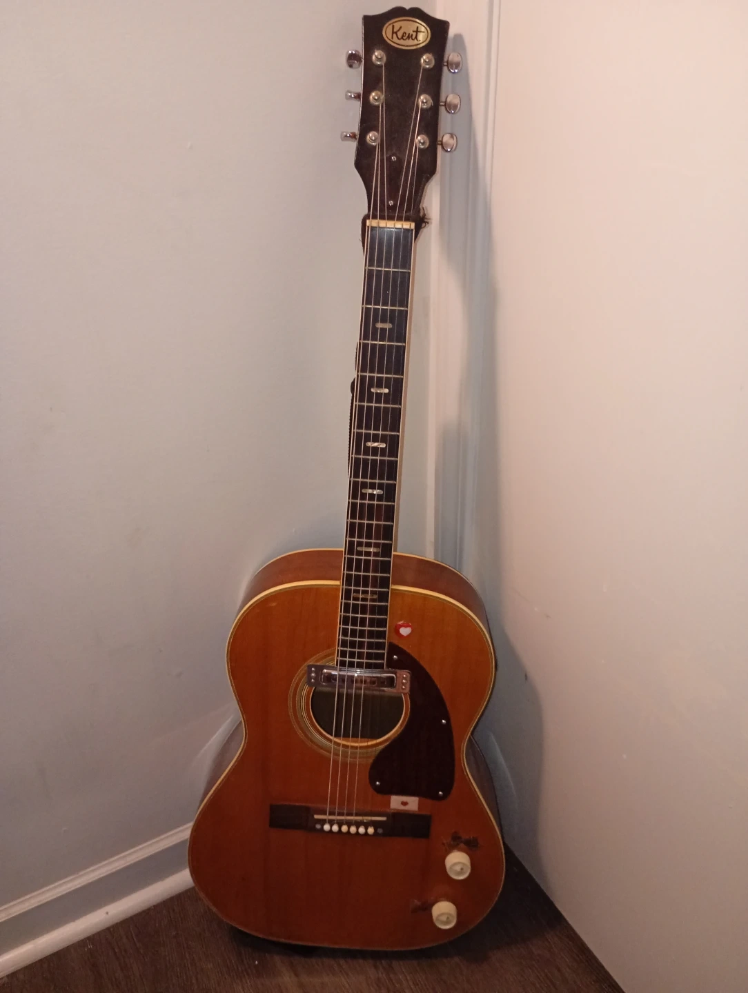 Acoustic guitar from Kent. It comes with a black gig bag for transport and storage. This guitar is ready for a new owner to play it!