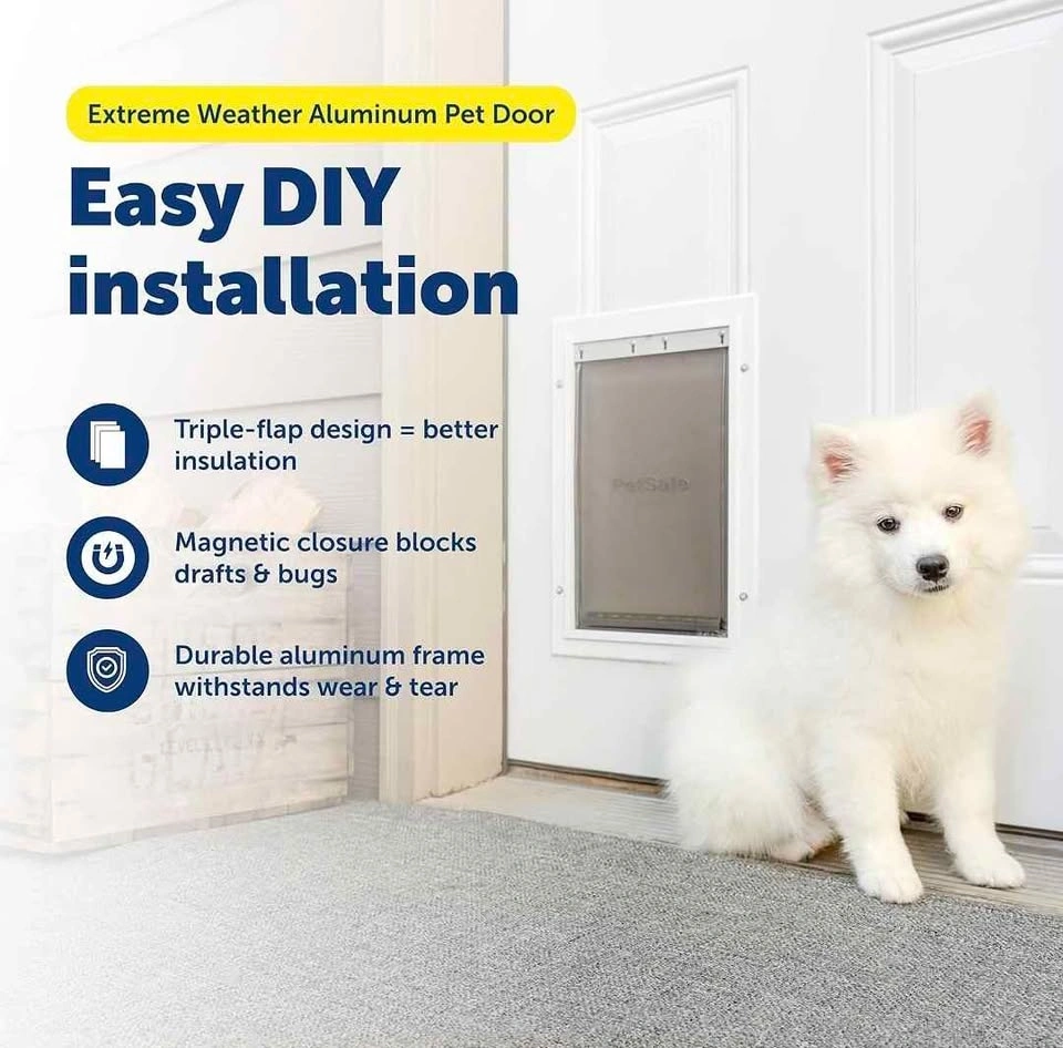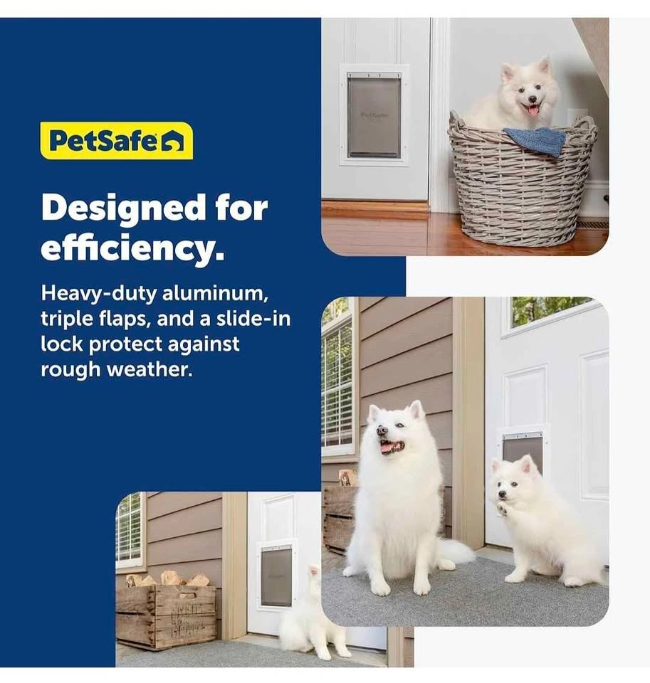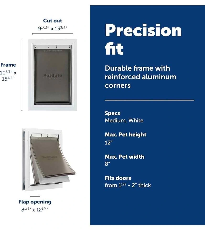 New in the box Pet Door – Size M, White. Brand: PetSafe. Compatible door thickness: 1 1/2" – 2". Features: Energy Efficient: Innovative 3-flap system helps reduce heat and cold air loss. Extra Insulation: Central insulated flap helps maintain indoor temperature. Controlled Access: Snap-on closing panel prevents pets from using the door when needed. Customizable Look: Paintable frame to match your door color. DIY Installation: Fits standard panelled, wood, metal, and PVC doors. Trusted Quality: Designed by a leading global pet brand.